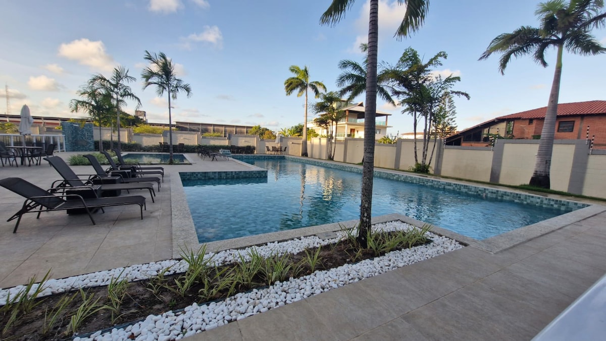 Se hospede em Ponta de Campina. A 500 metros da praia, 1km do Lovina Tropical; De carro,fica a 6 min de distância da orla de intermares que possui vários bares e restaurantes; 15 min da orla de Tambaú; 5min do Por do Sol do jacaré. Possui à sua disposição uma enorme piscina, sauna, quadra, área para crianças e pets, proporcionando uma estadia completa. Possui espaço para trabalhar remotamente. E o melhor, assista o fest verão de camarote. Quartos climatizados e diversas outras comodidades