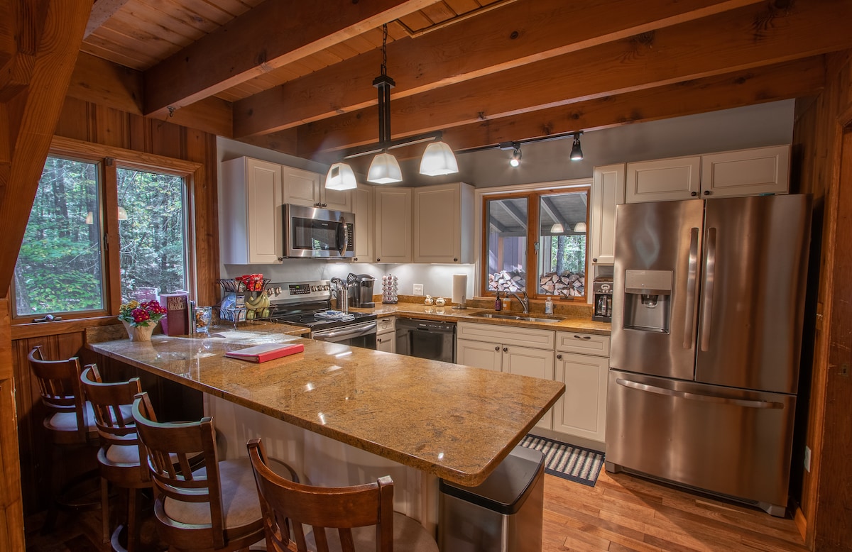 Relaxing modern getaway in Lost River, WV. Lofted ceiling, fully glass fronted cabin with beautiful wooded views. Featuring 1 queen bedroom, 2 full bed loft with spiral staircase, 1 full bath, fully stocked kitchen, open living room with two story glass windows, deck with hot tub & gas grill. High speed fiber internet and desk for remote work. Outdoor fire pit. Ideal for groups, families and couples. Dog friendly! WINTER RENTERS: You must have 4 wheel or all wheel drive in the event of snow.