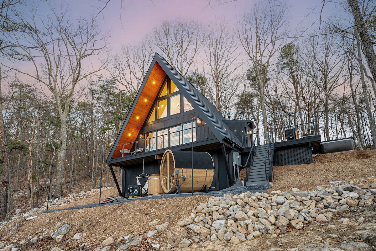 Tucked away in the woods, this Scandinavian-inspired treehouse is a quiet, peaceful spot designed for a relaxed couples getaway. Surrounded by trees and overlooking beautiful woodland views, it’s an easy place to slow down and unwind. Spend your time on the wraparound porch, soak in the hot tub, cool off in the creek, or settle in by the fire at night. This is a serene, comfortable retreat where you can reset, enjoy all that nature has to offer, and simply be present.
