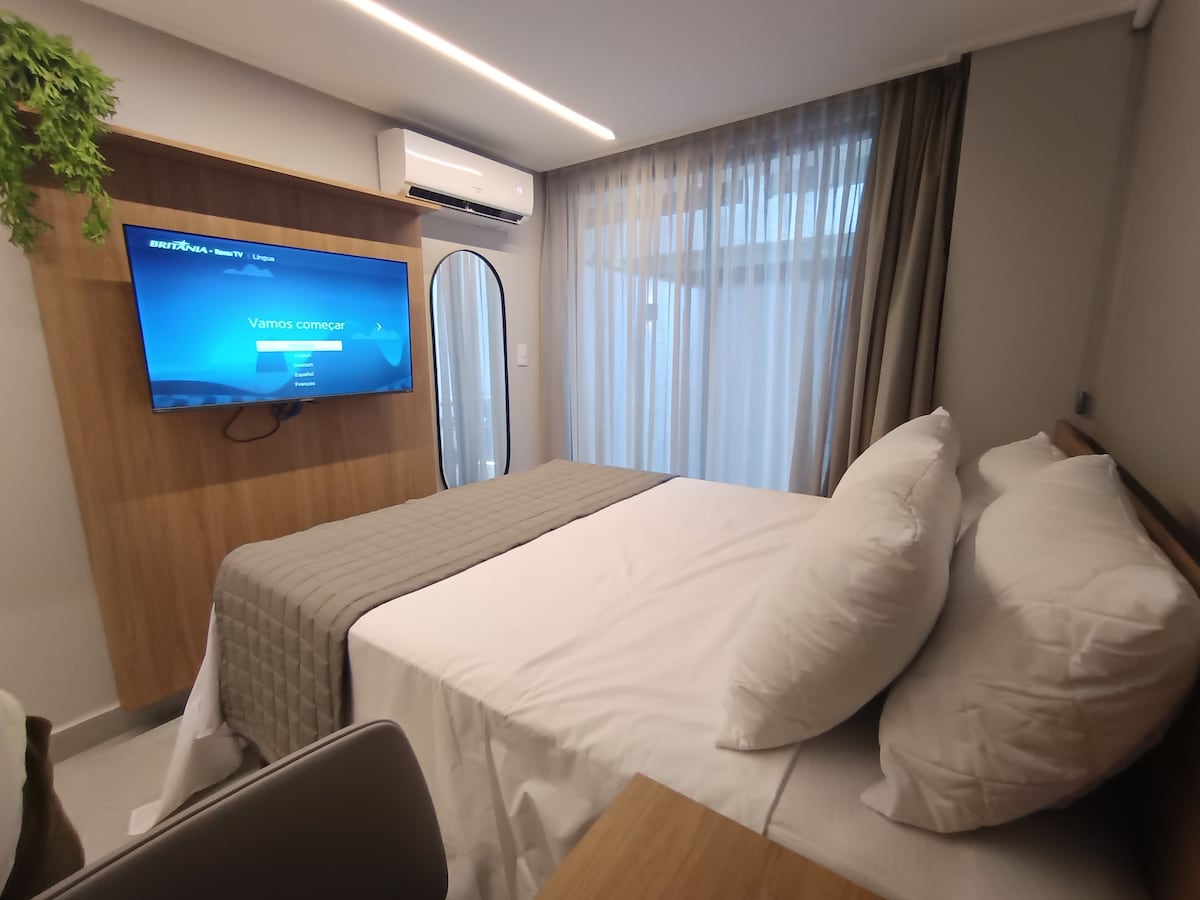 Flat com vista para o mar, localizado no bairro do cabo branco, 15 min do centro de convenções de João pessoa, 300m parada de ônibus. Acomodação possui, enxoval completo, varanda, internet individual gratis no quarto e internet por todo o empreendimento, piscina com borda infinita e restaurante no rooftop, smart tv led 49', ar condicionado, frigobar. Cozinha com cafeteira, micro-ondas, pratos, talhares, copos e taças, panelas e fogão. Máquina de gelo grátis, balde de gelo disponível no quarto.