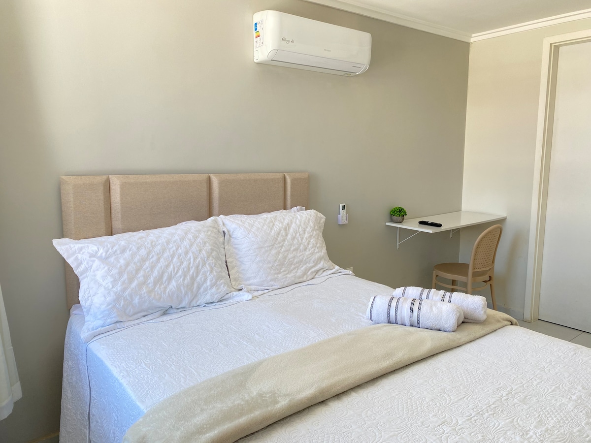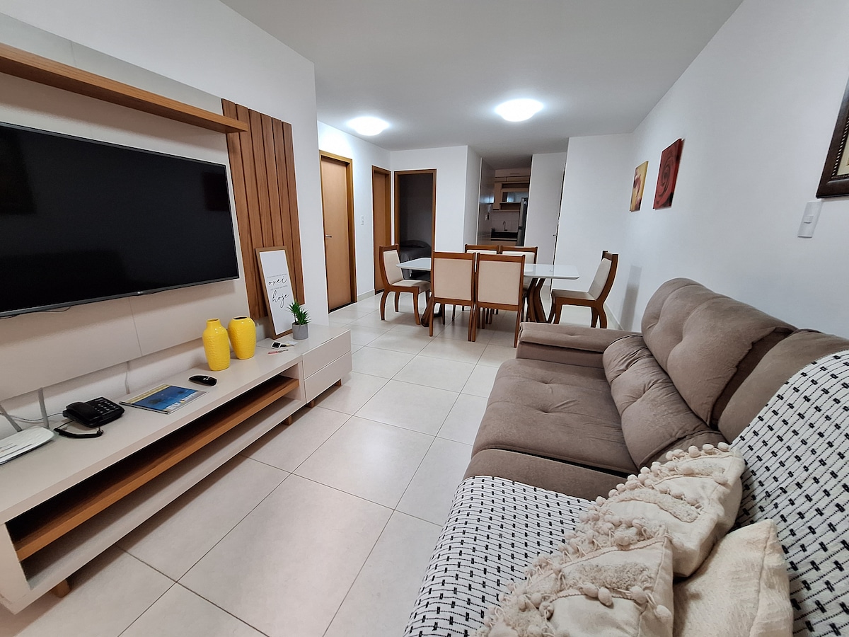 Excelente localização. Pertinho tem mercado, farmácia, restaurantes e padaria. Tudo para aproveitar ao máximo a sua estadia. O Wi-Fi de 250Mb com BOX TV da Claro, roupas de cama e banho, cozinha completa, chuveiros com água quente e ar condicionado em ambos os quartos. O prédio tem 2 elevadores, garagem coberta e área de Laser na cobertura com piscina, churrasqueira e cozinha de apoio além de uma linda vista panorâmica da cidade! PETs apenas de pequeno porte são permitidos.