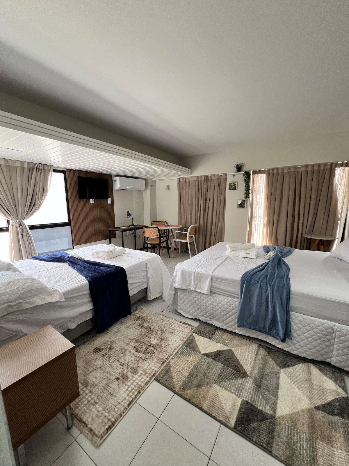 Confortável Suíte de 17m², equipada com ar condicionado, chuveiro elétrico, cama de casal, frigobar, cadeira de apoio, tv á cabo e com streaming, armário com cabides para roupas. Bem localizada, a beira mar de João Pessoa, ao lado do Mag shopping e próximo ao shopping Manaíra, próximo também de bares, restaurantes, sorveteria, padaria, local ótimo para caminhadas na praia ou no calçadão de Manaíra.