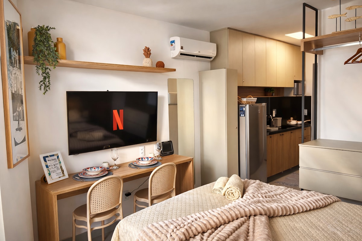 Flat com vista para o mar, localizado no bairro do cabo branco, 15 min do centro de convenções de João pessoa, 300m parada de ônibus. Acomodação possui, enxoval completo, varanda, internet individual gratis no quarto e internet por todo o empreendimento, piscina com borda infinita e restaurante no rooftop, smart tv led 49', ar condicionado, frigobar. Cozinha com cafeteira, micro-ondas, pratos, talhares, copos e taças, panelas e fogão. Máquina de gelo grátis, balde de gelo disponível no quarto.