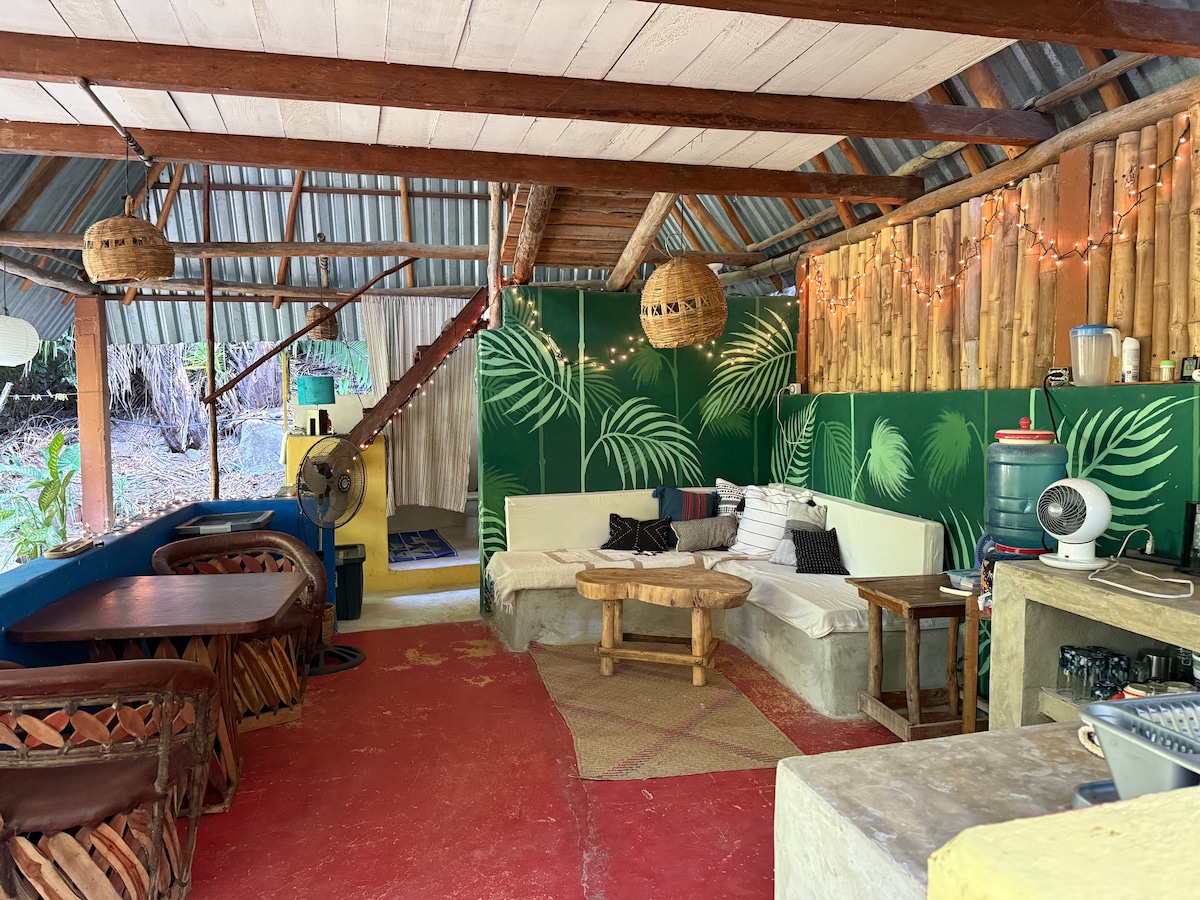 Jungle Bungalow is a charming . stone and brick house, large patio, close the beach, stores, restaurants, spacious patio with outdoor grill overlooks a lush gated garden with bananas and papaya trees. Just outside the gate is the beautiful natural Horcones River. It has one queen and one double bed, one accessed by a ladder that folds out from the wall. Decorated beautifully and tastefully it has a fully equipped kitchen, AC, overhead fans, and access to a laundry room. Reverberates with charm.