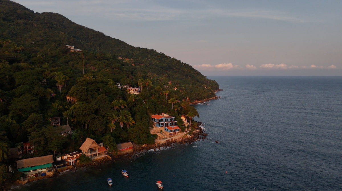 One of a kind 3 bedroom home with a gorgeous view of the ocean, beach and mountains. Located just a 3 minute walk from the town pier. Private pool and access to a small beach next to the house. Enjoy epic sunrises and sunsets at this oasis only accessible by boat in a magical town with no cars. *Important Note: Yelapa is a small village, considered rustic and remote, please take care the limited resources such as water and be prepared for an adventure. (Breakfast PREPARATION included)
