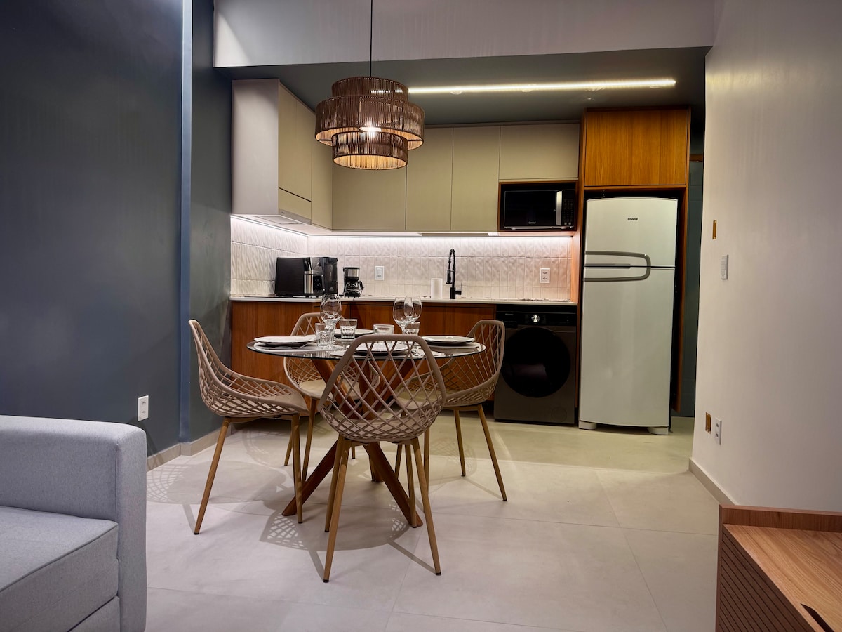 O NAUTILLUS 503 E' UNICO TODO O ANO Três ar condicionados inverter, lava e seca frontal, internet fibra, wi-fi, sistema de som wireless. Todo o conforto da zona exterior com jacuzzi, churrasqueira, cadeiras, mesas e guarda-sol. Espaco interno todo planejado, dois banheiros, um quarto queen, um quarto king, area de TV com sofa cama casal, duas area de trabalho e muito mais da descobrir. Estou a suas disposição para oferecer melhor solucao pra sua estadia.