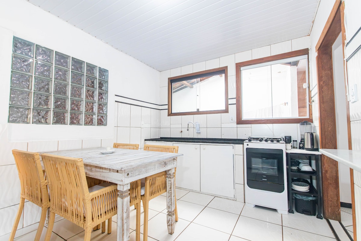 Cozy beach house on the ground floor of the condominium, with a two bedrooms and a living room, full social bathroom, well equipped kitchen and a parking space for one car in the condominium. Besides being close to the beach (2 blocks), it is close to a good trade (bakery, pharmacy, supermarket, restaurants, etc) and 1 km from the bus station. The house is great for couples, families with children and groups of friends.