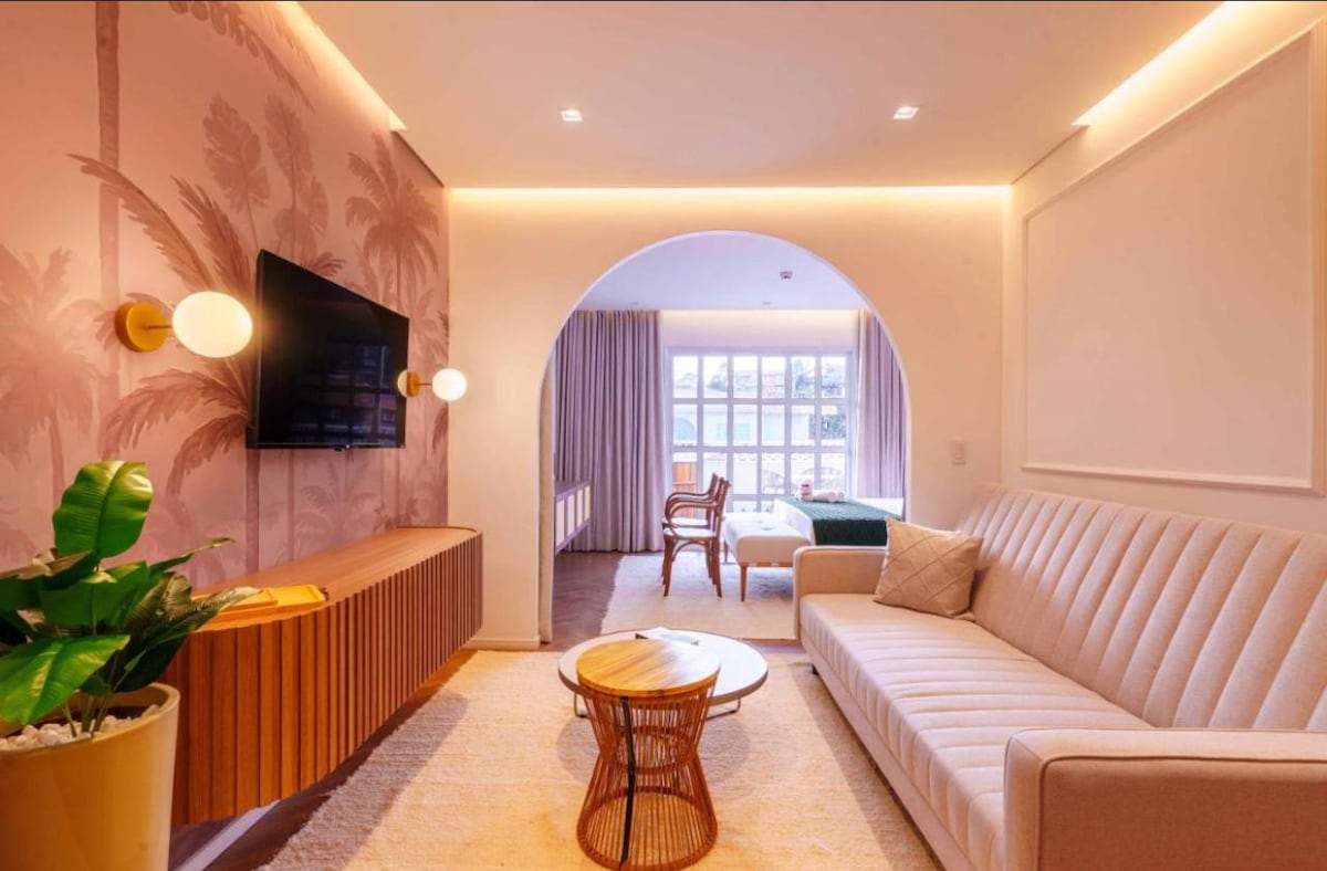 Apto de 2 quartos com vista para piscina em hotel boutique alto padrão recém inaugurado em Geribá. Ambiente sofisticado e muito confortável com 1 suíte, e um segundo quarto com possibilidade de dividir o ambiente para a sala. Possui varanda, uma minicozinha, área de estar com sofá-cama para 2 pessoas, e um segundo banheiro. Oferece TV, cooktop, microondas, frigobar, chaleira elétrica, e utensílios básicos. Instalações de spa e bem-estar, bar, piscina, sauna, parque infantil e espaço pet.