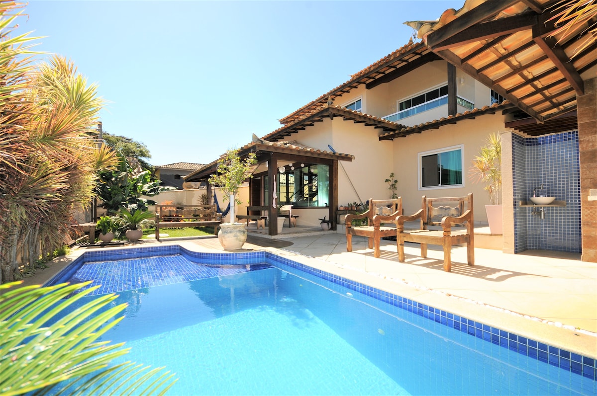 Beautiful house with swimming pool surrounded by native forest with swimming pool, ideal for relaxing and enjoying with the family, consisting of 3 bedrooms, 1 suite with dressing room on the upper floor with TV and two bedrooms on the ground floor, bathroom, living room/TV, kitchen American, barbecue area with pizza oven, balconies, hammock to relax.. It has quick and practical access to Ferradura beach, which is only 150.00 meters away. The house is fully equipped with bed and bath linen. WIFI