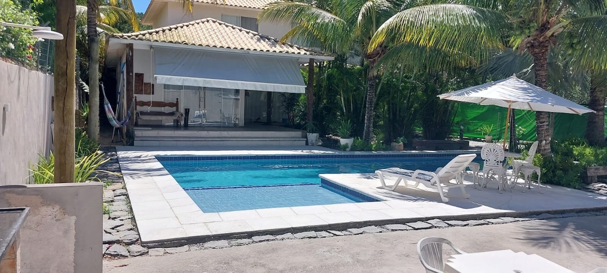 Bem-vindo(a) à sua casa de férias em Búzios! Localizada no condomínio Aretê, acomoda até 8 pessoas com conforto e tecnologia. São 4 suites com ar-condicionado, cortinas com blackout e colchões Ortobom. Aproveite a piscina aquecida, área gourmet com churrasqueira e TV 98" com Sky, Premiere, PlayStation e Alexa. O condomínio oferece clube de praia, piscina, sauna e pier. Temos camareira incluída, com opção de chef e serviços extras. Reserve agora e desfrute de momentos inesquecíveis!