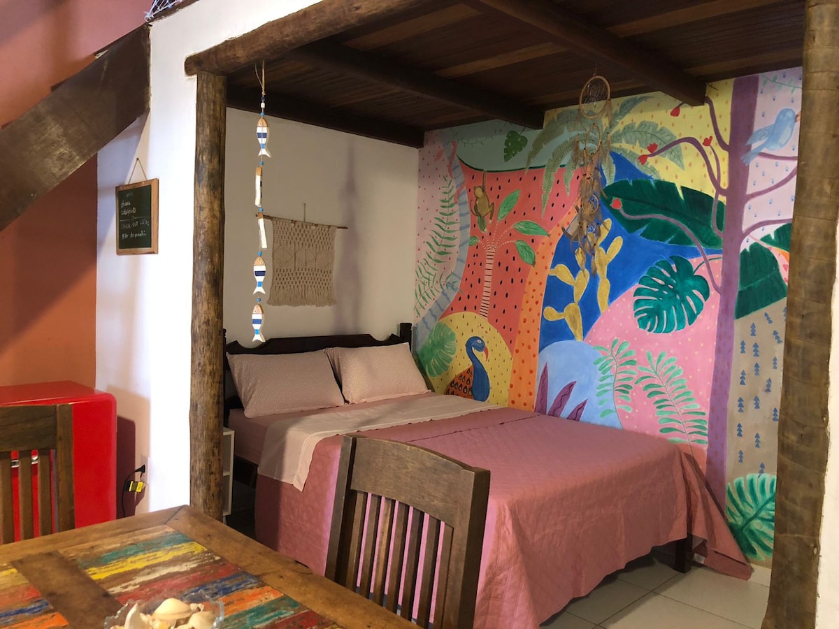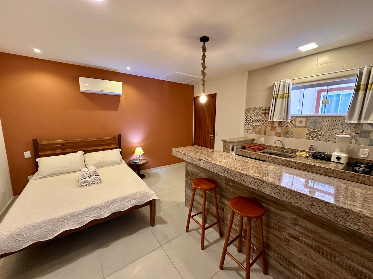 Loft aconchegante para até duas pessoas em Búzios, a apenas 1 km da Praia de Geribá e 3 km da Rua das Pedras. Ideal para casais ou amigos, conta com TV, frigobar e cozinha para preparar suas refeições. Espaço confortável, charmoso e bem localizado para quem quer curtir o melhor de Búzios com praticidade e tranquilidade
