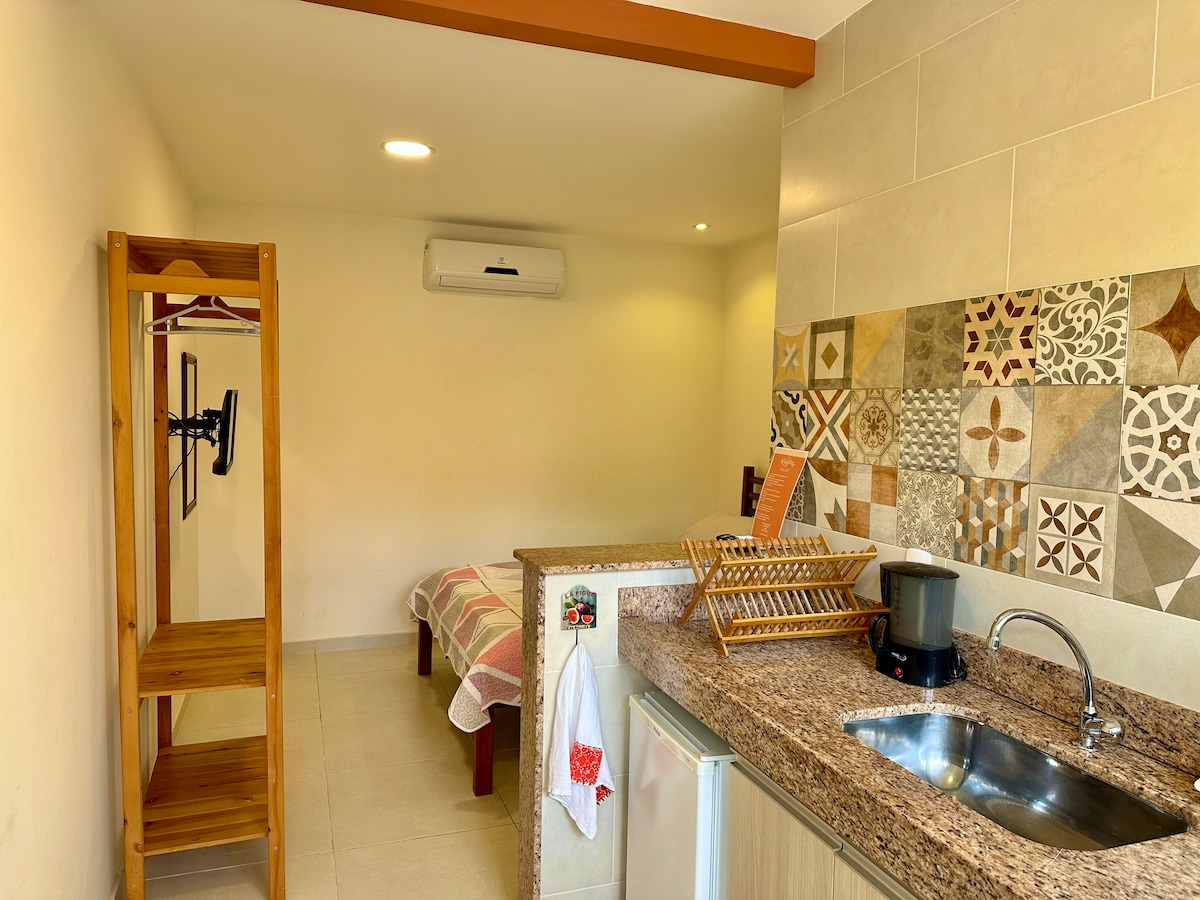 Relaxe neste lugar único e tranquilo. No espaço.temos uma cama de casal, TV smart 32 polegadas, mesa com duas cadeiras, Área de cozinha com microondas, geladeira, cafeteira, liquidificador, sanduicheira, armário, pia, pratos, copos, xícaras e talheres. Temos garagem e churrasqueira compartilhada.