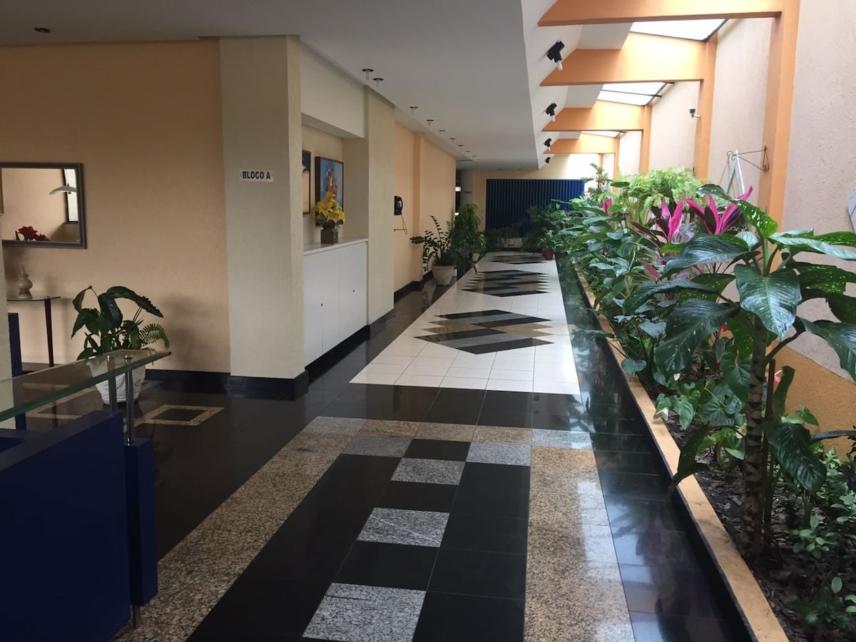O flat oferece. Quarto com ar condicionado, Smart TV, Wi-fi, uma cama Queen, 2 colchonetes, um cofre, uma cozinha super equipada (Com cooktop, frigobar, microondas, cafeteira, sanduicheira, panela de arroz elétrica, panelas e utensílios de cozinha), uma pequena varanda, um banheiro com aquecimento no chuveiro e torneiras. Estacionamento incluso nas diárias. Recepção 24h Elevadores, academia, bar, sauna, piscina e restaurante. ⚠️Café da manhã não incluso nas diárias.
