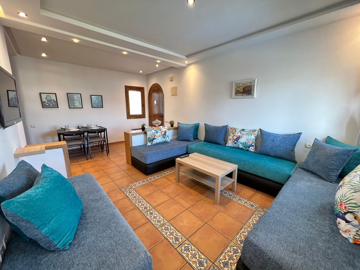 Bienvenue dans votre retraite méditerranéenne ♥️🇲🇦♥️ Appartement neuf confortable et moderne au deuxième étage avec des appareils et des équipements modernes. Situé au cœur de cabo negro dans la résidence de mirador golf 2 , à 10 km de Tetouan et 24 km de Ceuta et à mois de 3 min en voiture de l’une des plus belles plages du Maroc, à quelques pas d’un grand nombre de restaurants et lieux de divertissement pour votre séjour à cabo negro.