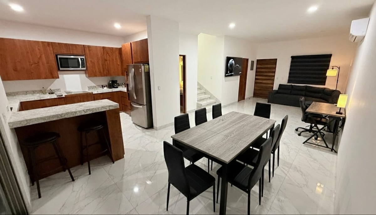 Departamento totalmente equipado y amueblado para hasta 4 personas. Cuenta con una habitación para dos personas y en la sala área común con un sofá-cama para dos personas. Totalmente recomendado para parejas con hasta 2 hijos. Especial para descansar, no tenemos ventana en el cuarto principal, especial para descanso ya que no se filtra el sol ni los ruidos. Una ventana en la sala y baño. Gran luz artificial Si te gusta descansar con poca luz este lugar es para ti