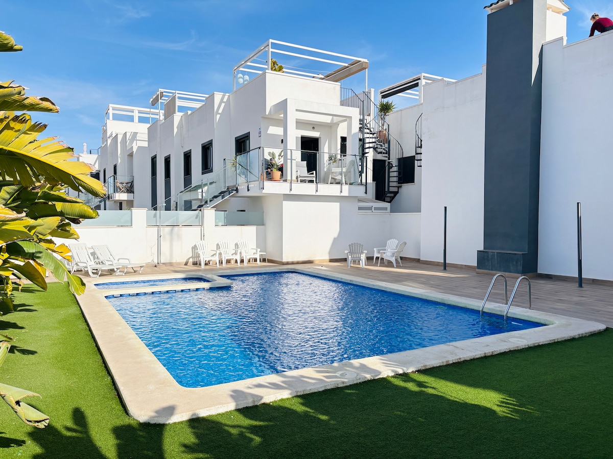 Exclusive home with private heated swimming pool 8x4 m. The house has 2 floors and a roof-top terrace, 36m2. A garden with palm-/citrustrees, furnished terrace . A toilet and shower is next to the pool. 4 bedroom suites, 2 bedroms with own bathrooms, and 2 bedrooms who sharing one bathroom, 3 bathroom in total. Spacious living-dining room with a comfortable lounge-area with a guest toilet. 1 large sofa- and 1 large dininggroup on the outdoor terrace by the pool. 10 min walk to the beach