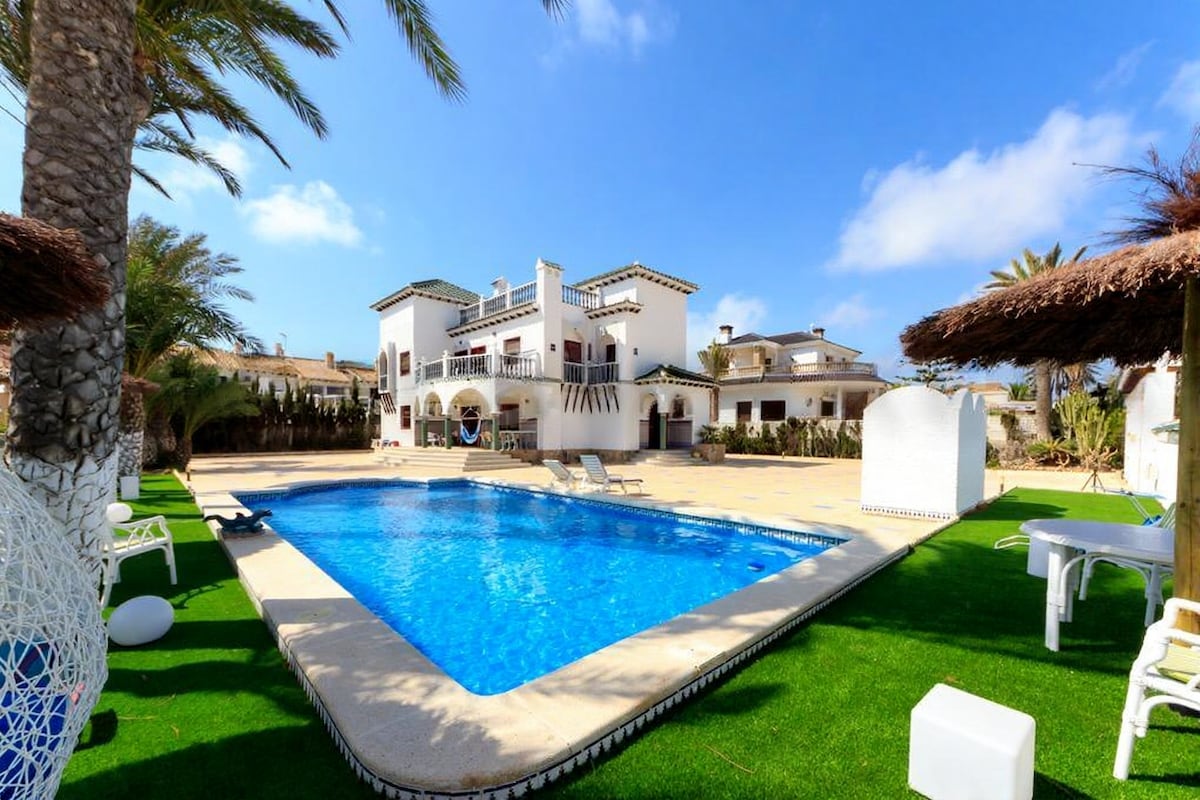 Espectacular Villa en primera linea de mar de Cabo Roig. Muy elegante y espaciosa, esta formidable Villa está compuesta por 7 dormitorios y 4 baños + aseo, salón, comedor y cocina, además de salón secundario y cocina secundaria. Tiene unas vistas embriagadoras a la gozosa bahía de Cabo Roig, entre pinos mediterráneos. La piscina tiene una profundidad de 0,5 mts.