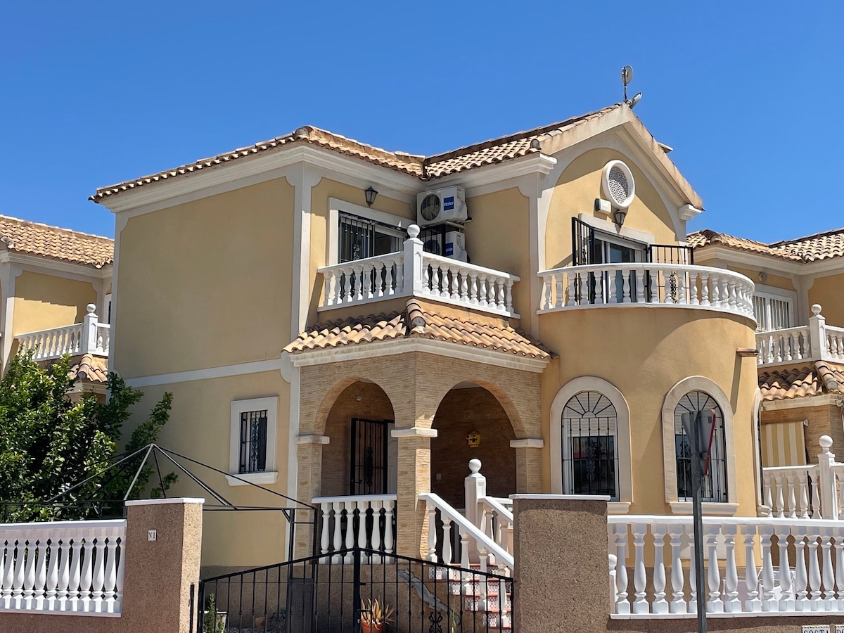 Schickes Ferienhaus „Casa del Mar“ für max. 6 P. , 300m vom Strand in Cabo Roig Privater Salzwasser Pool WLAN + Parkplatz inklusive Dachterrasse mit Meerblick Nicht für Partygäste geeignet! Smart TV + Klimaanlage im Wohnzimmer und Hauptschlafzimmer Arbeitszimmer 3 Schlafzimmer 2,5 Bäder Aussendusche (warm) am Pool Terrassen mit Relax Möbeln/Liegen großer Gas-Grill luxuriöse Küche Waschmaschine + Trockner ruhige Privatstrasse Keine Haustiere. Rauchen ist nur draußen erlaubt