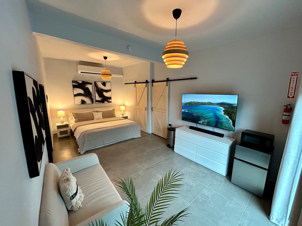 Comfortable Air Conditioned Alcove Studio Apartment with A BIG, PRIVATE, SUNNY DECK w beautiful panoramic Caribbean Sea views of the coastal countryside & el Faro de Fajardo Spanish Lighthouse. Walk to Seven Seas Beach, the Bio Bay, El Conquistador Resort & Seafood Restaurants. Enjoy walking around our safe Seaside Village on Cabo San Juan with scenic views, clean fresh air & paradise weather instead of being cooped up in a condo or hotel where you have to drive everywhere. FREE PRIVATE PARKING.