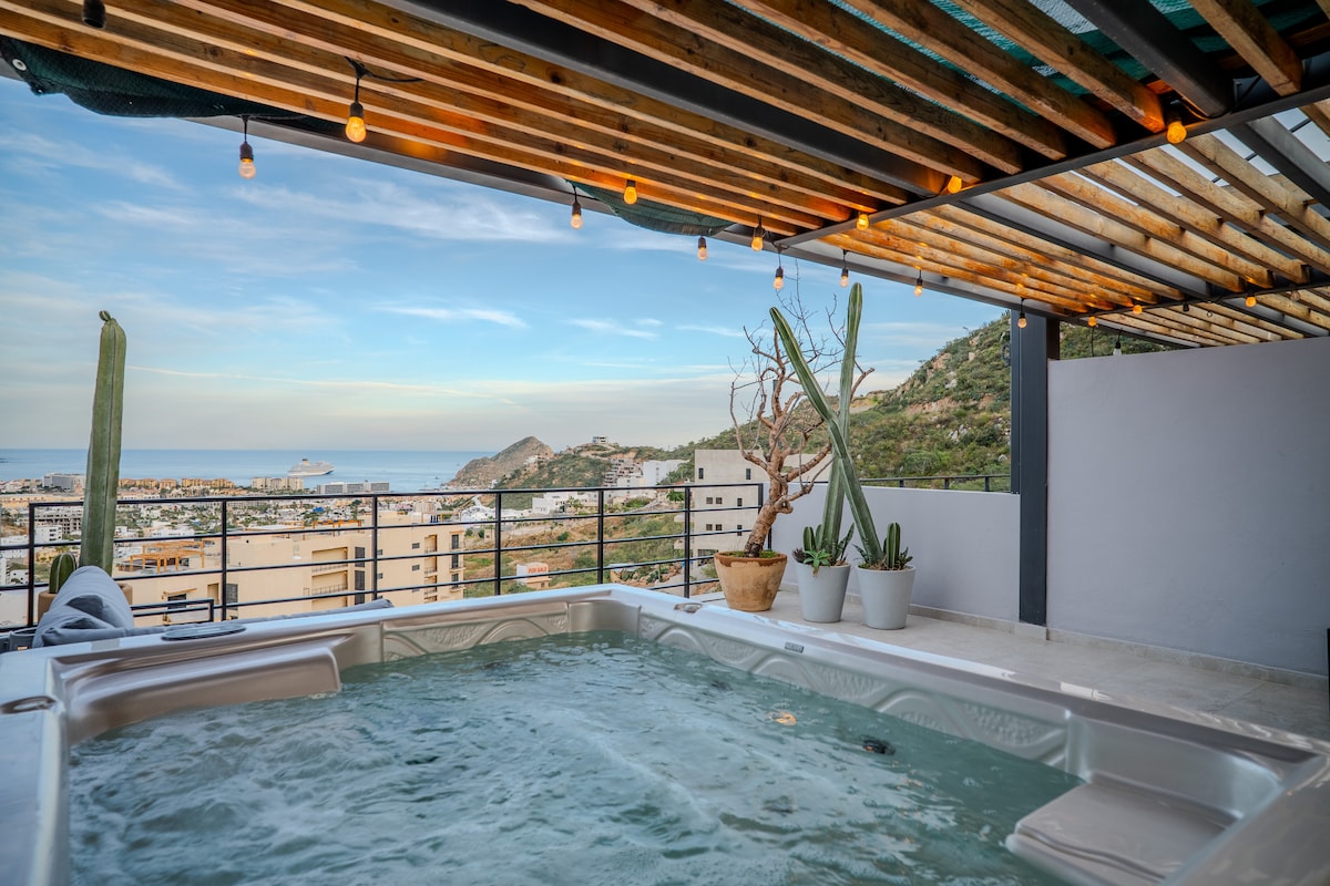 ¡Disfruta de este hermoso loft panorámico con jacuzzi privado, ubicado en la Marina de Cabo San Lucas, El espacio ofrece comodidad, privacidad y una vista espectacular, ideal para disfrutar Cabo caminando a restaurantes, bares, tours y vida nocturna. El loft está preparado para hasta 4 huéspedes, con cama King Size y sofá cama Queen Size, perfecto para parejas, amigos o familias pequeñas. Después de un día en la playa, relájate en el jacuzzi con vista a la marina.