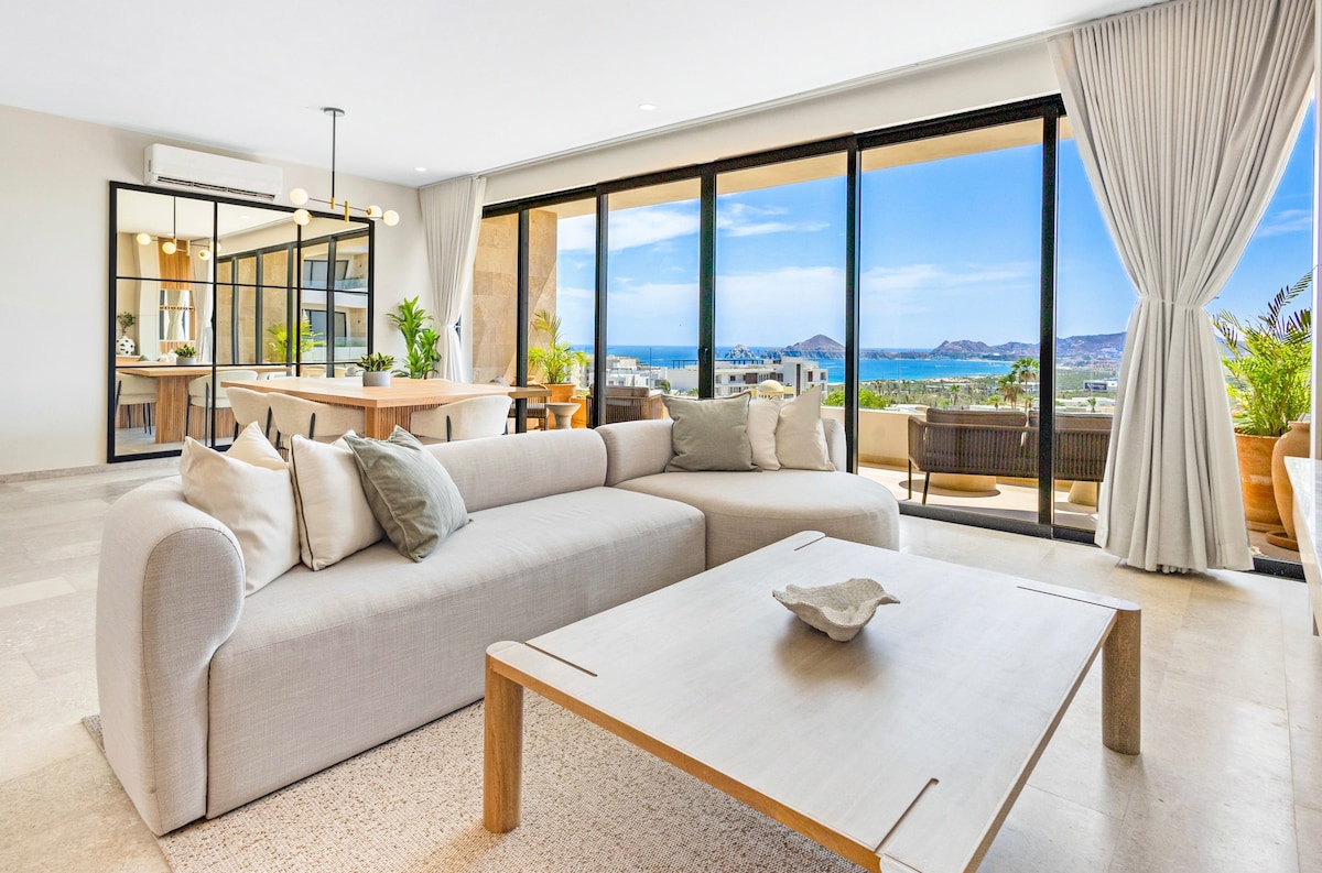 The condo's 180º view lets you enjoy sunrise and sunset at the Cabo Arch from your breakfast-dinner table! Terrace design offers intimacy and escape. Ideal for a romantic stay, home office with paradise views, BBQ dinners with sunset vistas, relaxing hammock siestas, whale-watching while cooking, and sunrise views from bed! Walking access to Cabo's top two beaches and next to The Cape and Thompson Hotel. Please remember, this is a rental condo, not a hotel, and the price reflects that.