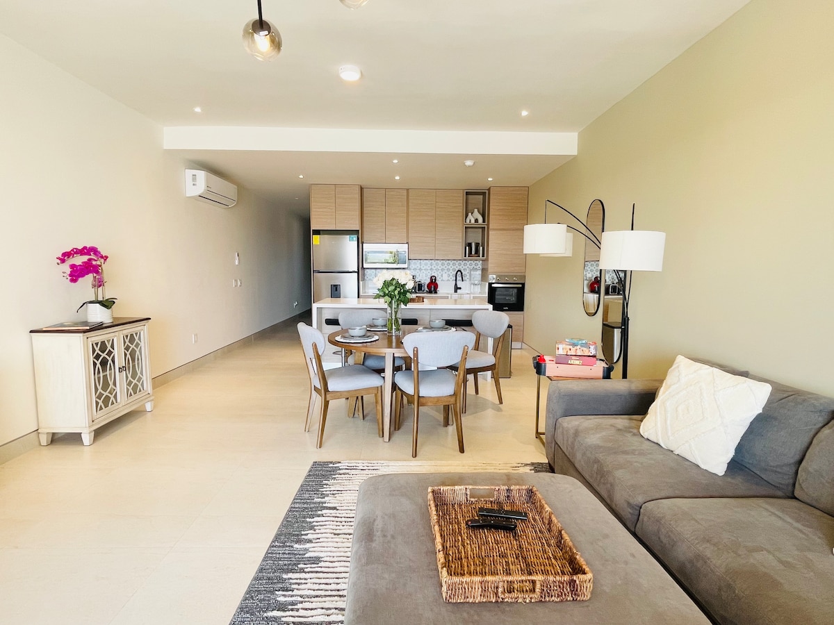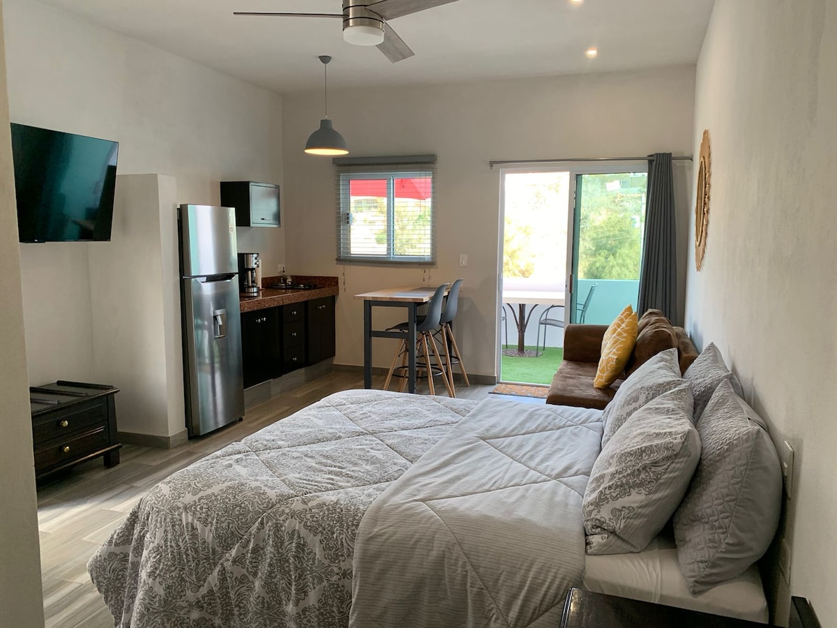 Cozy 1 bedroom apartment, located on a new and modern building that has an enchanting rooftop terrace, where the pool, jacuzzi and firepit are located, all of this framed by the stunning views to downtown, the marina and the Sea of Cortes. The building is located walking distance from downtown and the marina, its conveniently located close enough to this areas to get them easily but far enough from its noise so you can relax as well.
