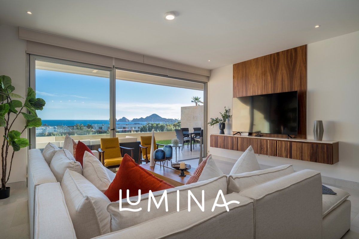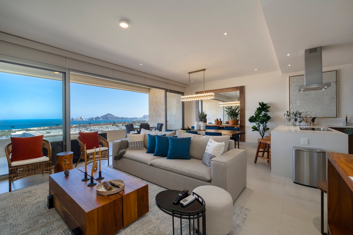 - Sweeping bay and Arch views from your private wraparound terrace: perfect for morning coffee or sunset cocktails. - Tennis courts, climate-controlled pool, and fully-equipped gym. - Two spacious bedrooms sleep 6 comfortably with a dedicated workspace, full kitchen, and in-unit washer/dryer. - Walk 5 min to Costco and Soriana for easy grocery runs or visit the marina restaurants and nightlife. - Reserve now for a serene retreat with all comforts and a welcoming host!