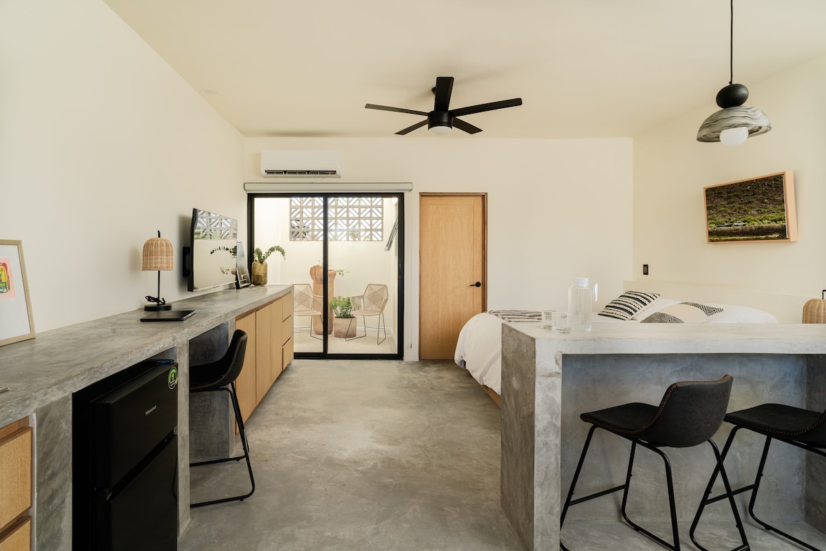 Descubre nuestro hermoso estudio de lujo de 1 cama king size y 1 baño equipado en uno de los vecindarios más seguros de cabo Tendrás unas vacaciones memorables en los Cabos. Nuestras amenidades de lujo y albercas te harán sentir como en un resort! A solo unos cuantos de la carretera principal de los Cabos que ofrece fácil movilidad. A unos cuantos pasos de Costco. Nuestra terraza equipada, escritorio para home office, cocineta y WiFi brindan la mejor de las comodidades.
