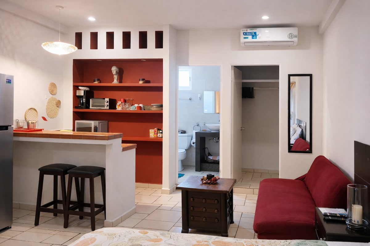 This lovely studio in Cabo San Lucas is close to downtown, the beach, and nightlife. It has a private bathroom and a fully equipped kitchen with pots, pans, and essential cooking utensils. Only a 10-minute walk to downtown Cabo San Lucas, with bars, cafes, restaurants, and shopping centers, as well as convenience stores, laundromats, bakeries, pharmacies, bus stops, and tortilla shops. Everything is within walking distance!
