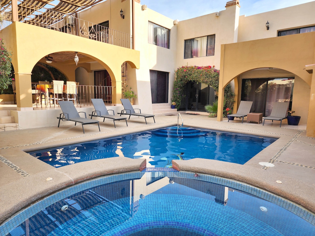 Think a short getaway or month(s) to rest/remote work or explore Baja. Open layout allows comfy lifestyle for just a couple yet can suit a gathering up to 10. -- Includes 3 bdrms + tiny bunk bdrm upstairs. + 5th separate studio bdrm on ground level with separate entrance. -- Well equipped kitchen, BBQ. --Large, level & very private patio & pool area. No shared spaces. --Ideal location. Beach, eateries, shops are all within easy walking 5 - 10 mins. Parking for 1 car only. Come and enjoy!