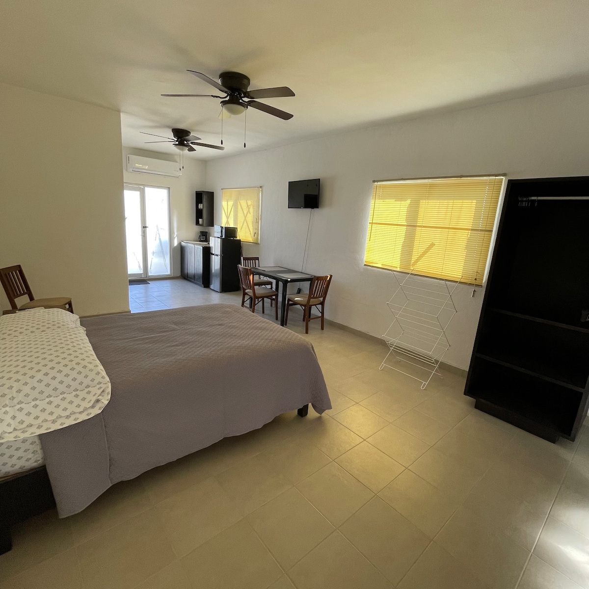 Cómodo estudio para 2 personas con excelente ubicación. A tres cuadras de la carretera Transpeninsular y cerca del centro de San José del Cabo. El estudio está equipado con una cocineta, un frigobar y utensilios básicos de cocina, televisión con Chromecast, Wifi, aire acondicionado, equipo para playa y entrada independiente.