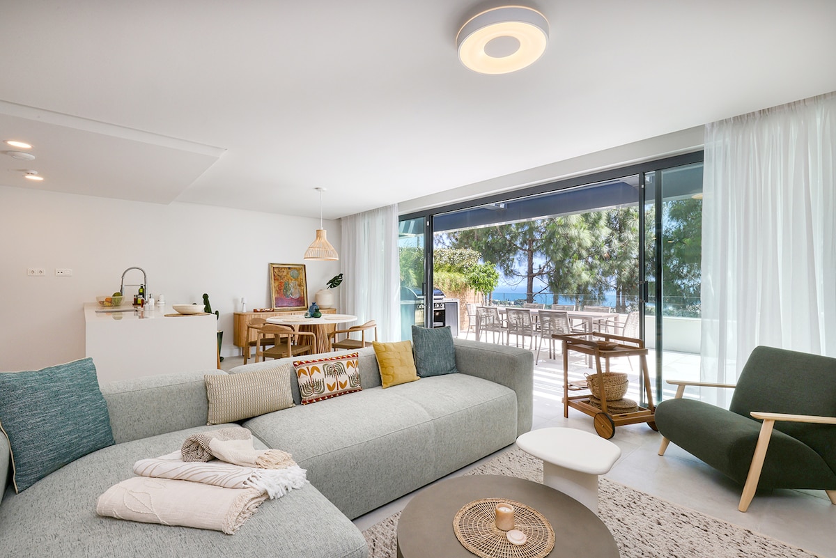 Wonderful design apartment with terrace and garden overlooking the sea and Cabopino Golf Course. Next to the famous Golf Course. Apartment with 2 bedrooms, entrance hall, living room open to terrace with a fantastic sea view, open fully equipped kitchen (oven, microwave, dishwasher, washing machine, dryer, espresso machine, toaster) Cabopino has a delightful harbour and one of the most beautiful beaches of Marbella. Marbella centre is at 12 km. Only 30 minutes by car from Malaga Airport.