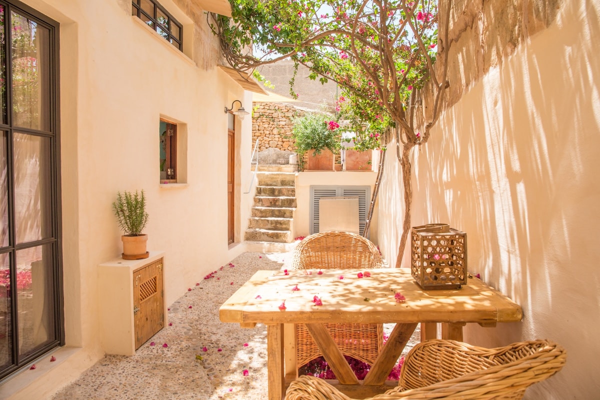 Lovingly renovated Majorcan village house with patio and roof terrace in SantanyiThrough the generous living and dining room with open kitchen on the ground floor you enter the patio, which offers relaxation space on 2 levels. In the rear part of the ground floor there is a cozy double bedroom with water bed, a bathroom and a small single bedroom. Upstairs there is another living room with mini-kitchen, a double and a single bedroom plus a bathroom with shower.