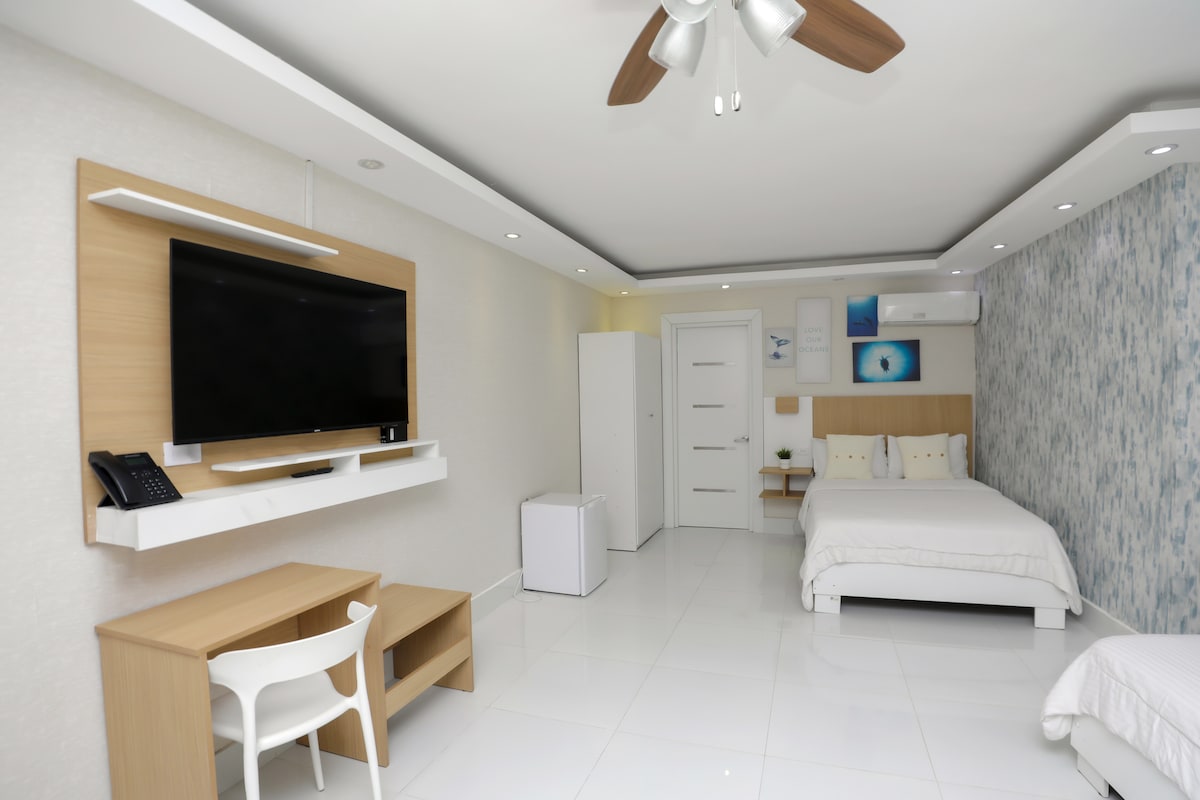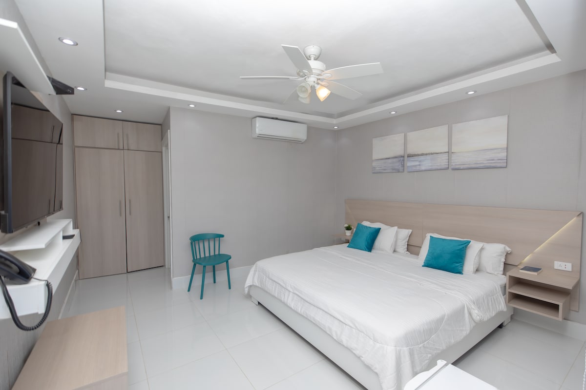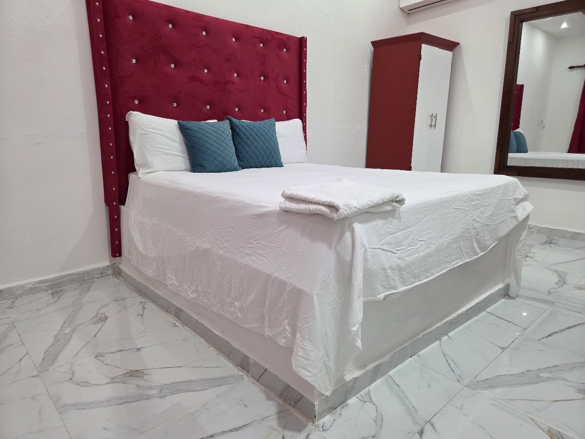 Vive una escapada llena de color y pasión. Esta habitación, con su vibrante cabecera roja como protagonista, está diseñada para una experiencia inolvidable en pareja. Disfruta de un espacio íntimo con un estilo audaz, elegantes pisos de mármol y un moderno baño. Aquí tienes todo para tu confort: aire acondicionado, un pequeño escritorio y la garantía de nuestra planta eléctrica 24/7. Con el parqueo resuelto y la playa tan cerca, solo tienes que dedicarte a disfrutar. El refugio perfecto para dos