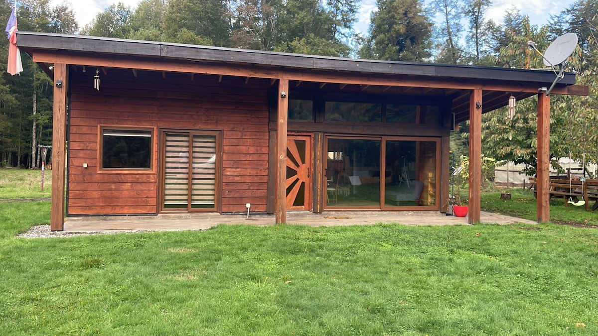 Beautiful Cabin in the Forest, located in the Lefún area between Villarrica and Pucón. It offers a stunning view of Villarrica Volcano, surrounded by native forest and birds. Every day you can hear Loicas and Chucaos. Fully equipped so you can enjoy your stay, disconnect, and relax. A lovely stream runs through the property. We recommend taking nighttime photos of Villarrica Volcano next to the wood stove with the panoramic view our cabin offers. We are sure you will love it!