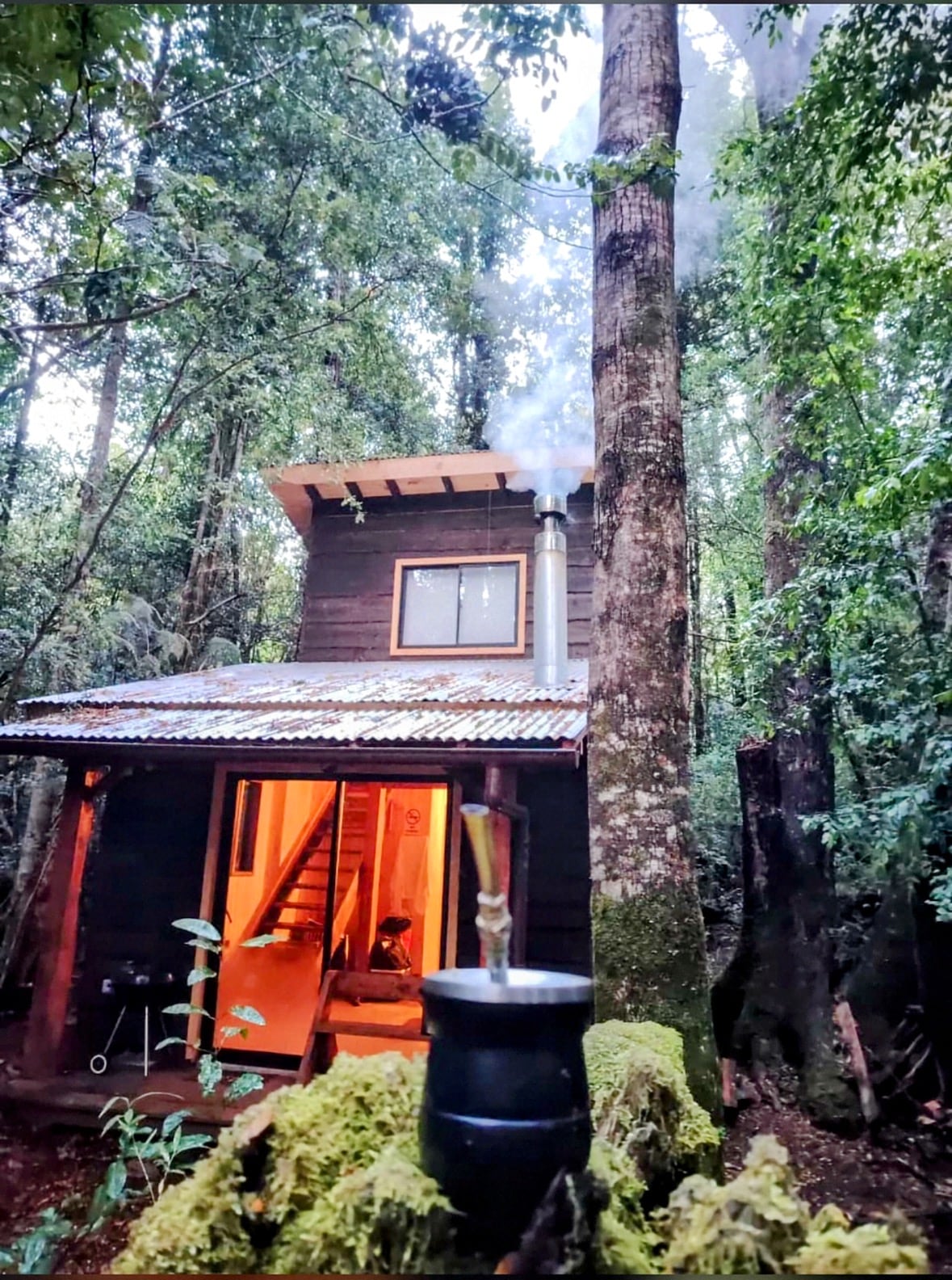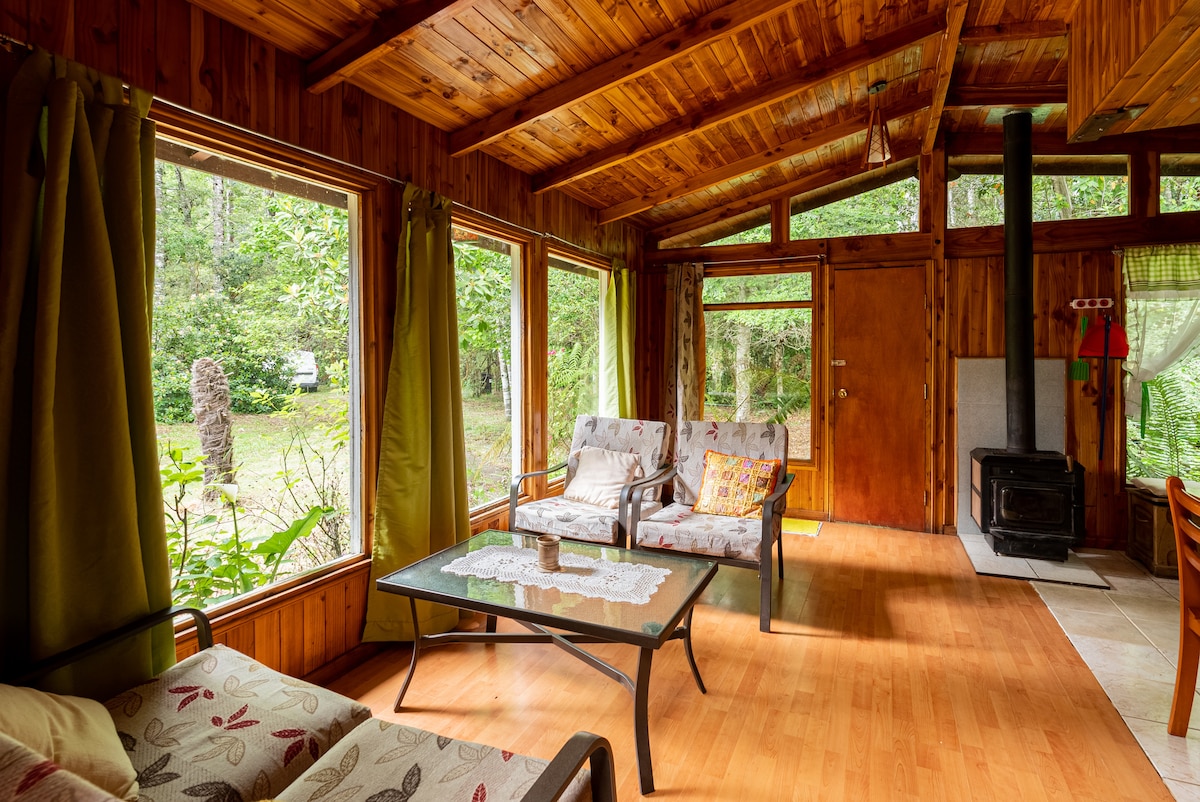Beautiful Cabin in the Forest, located in the Lefún area between Villarrica and Pucón. It offers a stunning view of Villarrica Volcano, surrounded by native forest and birds. Every day you can hear Loicas and Chucaos. Fully equipped so you can enjoy your stay, disconnect, and relax. A lovely stream runs through the property. We recommend taking nighttime photos of Villarrica Volcano next to the wood stove with the panoramic view our cabin offers. We are sure you will love it!