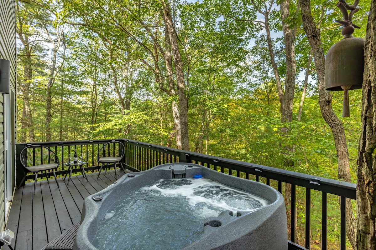 Uniquely spacious escape for couple, small family, or solo traveler. 30-foot great room, wall of windows facing large deck, oak floors NEW HOT TUB in private setting. King bedroom with en suite bath; loft has twin bed. Modern with touches of mcm & vintage create a magical retreat for you in the treetops. On 2 acres. Hike to top of Cacapon Mountain from back door. Quick drive (3 mins) to private community pool/hot tub/tot pool (summer only). 10 minutes to Berkeley Springs with Roman Baths, arts s