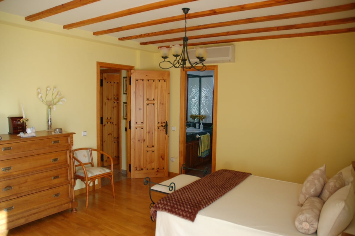 La casa rural El Herragú está situada en el municipio de El Arenal. Fuera del casco urbano, pero a solo 10 minutos caminando, este encantador chalet de más de 150m2 puede alojar cómodamente a 10 personas. Con una arquitectura única, cuenta con 5 habitaciones dobles, dos de ellas con espectaculares techos abiertos. Tiene una gran cocina, salón-comedor, sala de estar, 2 baños completos y un aseo. El espacio exterior consta de un espacioso porche con muebles de jardín, hamaca, pradera y fuentes.