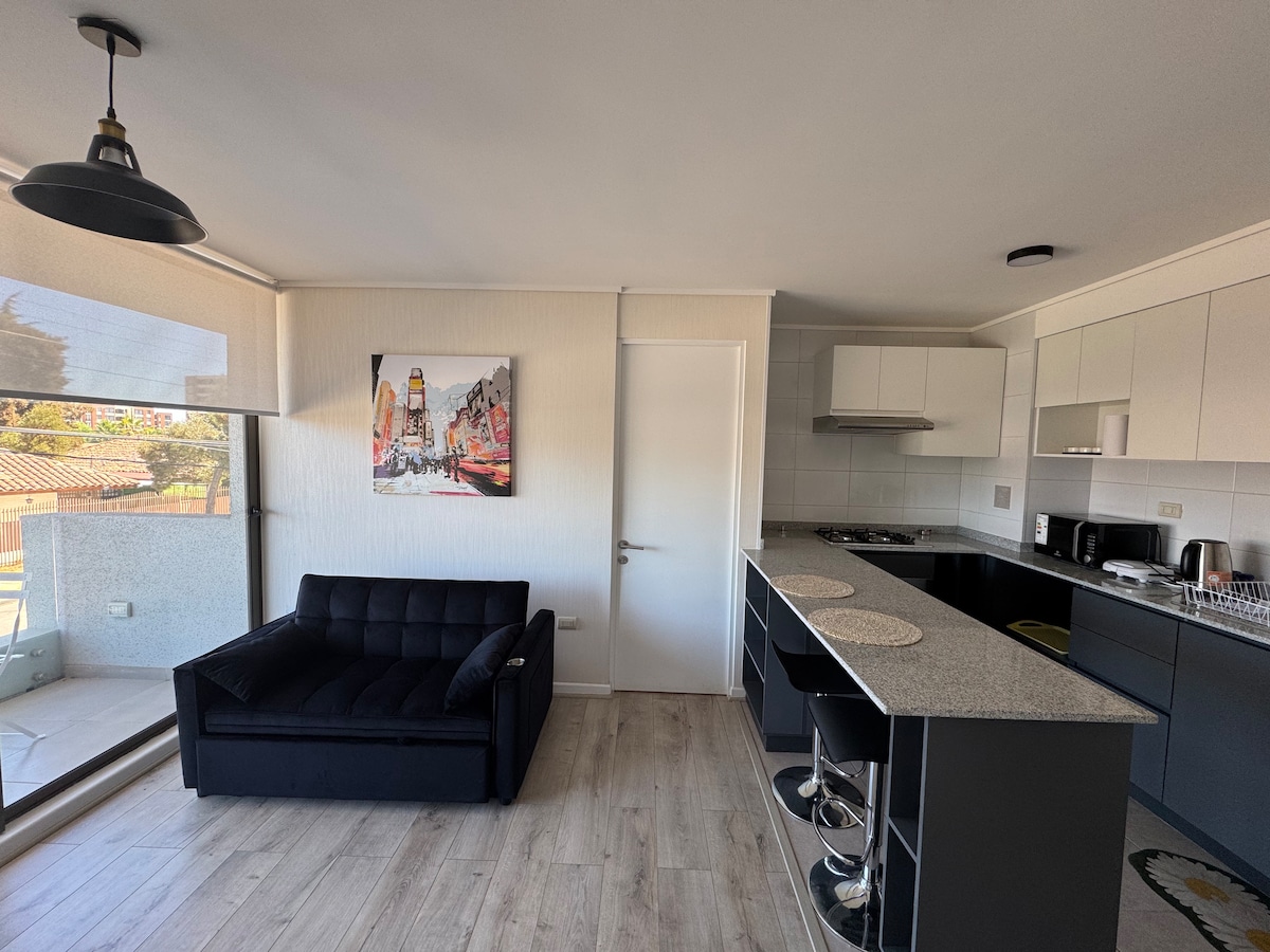 Cozy Studio in the Heart of Rancagua This modern one-room studio is designed to offer you comfort and functionality. Everything you need for two people Fully equipped kitchen Rest and entertainment area Well-equipped bathroom Excellent location: Just 5 minutes from Terminal O'Higgins 6 minutes from the train terminal 4 minutes walking to Universidad O'Higgins Easy access to public transportation from the street