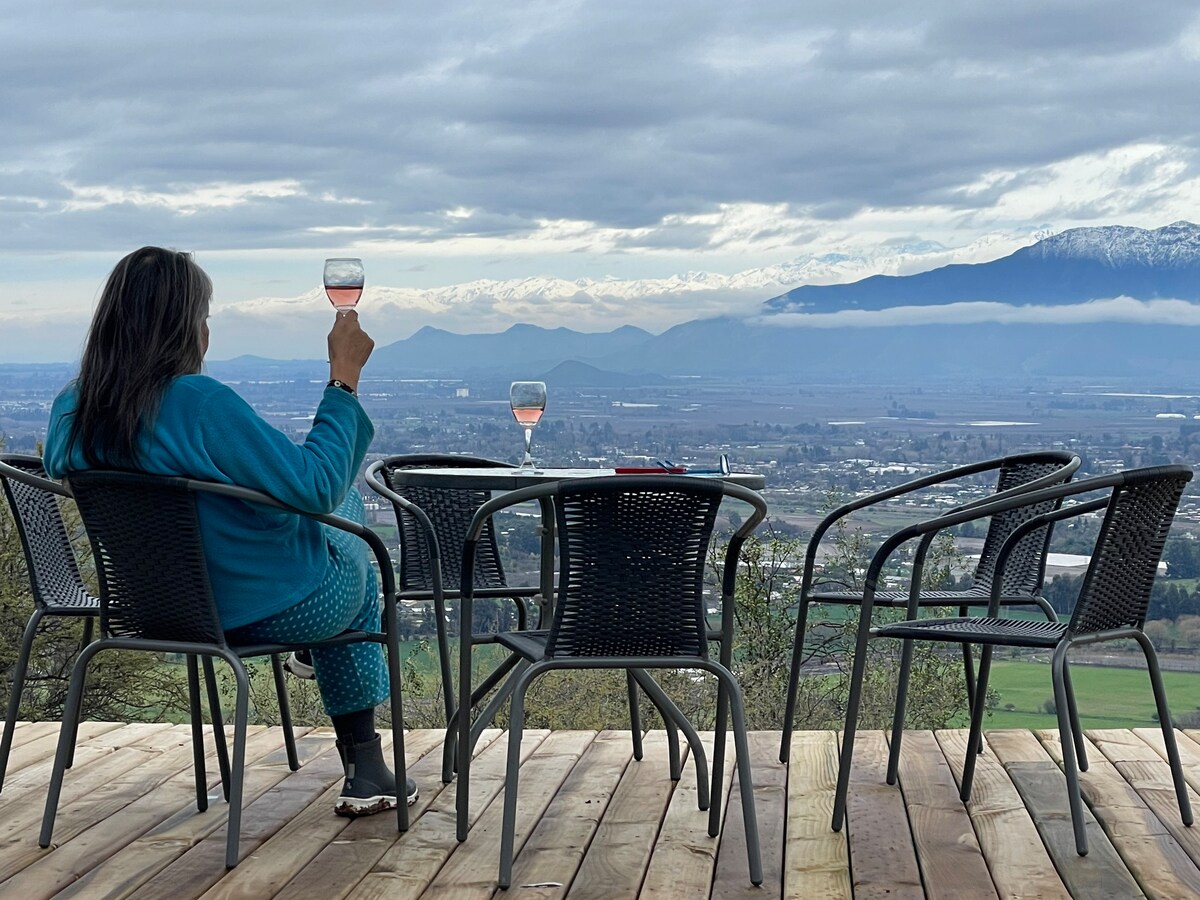 Hermosa casa a 55 km de Santiago en medio de la flora y fauna, con vista espectacular al valle central sobre los 700 m.s.n.m. en medio de la cordillera de Cantillana. Ideal para avistamiento de aves, insectos y arácnidos, trekking, gastronomía gourmet y variedad de viñas cercanas para disfrutar. • Piscina exclusiva. • Tinaja en terraza con vista al valle y colindante con piscina para compartir temperaturas de aguas. Costo adicional por cada uso. • No es espacio compartido con otros huéspedes.