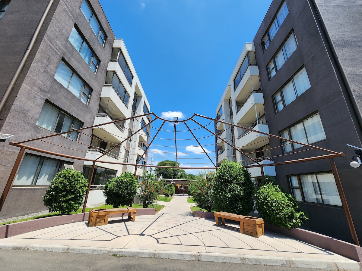 Disfrute de su estadía en rancagua en un departamento nuevo con excelente ubicación y conectividad, a pasos de la "Alameda", Casco Histórico, Centros Comerciales, de Salud, Restaurantes entre otros Cuenta con acceso controlado 24hrs, Estacionamiento techado, Bicicletero, Juegos Infantiles, Quincho, Piscina, Gimnasio y Lavanderia. El inmueble tiene cama 2 plazas, cama 1 plaza y un sillon cama con colchón 1 plaza. AIRE ACONDICINADO, cocina completa y toallas para nuestros huespedes.