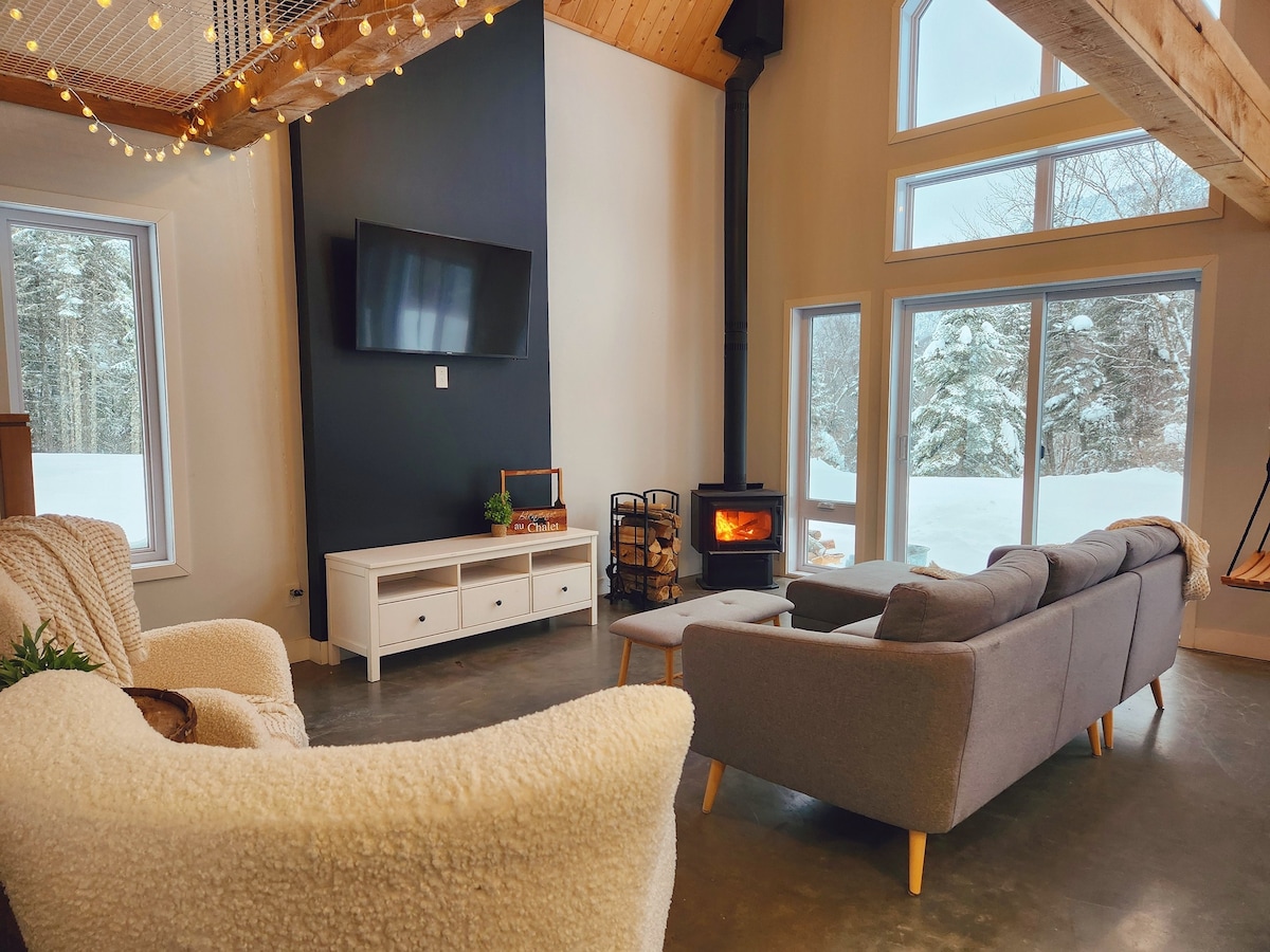 Welcome to Horizon, a magnificent cabin nestled in the heart of an enchanting landscape, at 565 meters above sea level. The bike-in/bike-out experience on the mountain bike, fatbike, snowshoe and hiking trails of the Sentiers du Moulin. This quiet and intimate refuge offers stunning views of the surrounding peaks and allows you to fully immerse yourself in nature. The chalet can accommodate up to 6 people thanks to its catamaran net!
