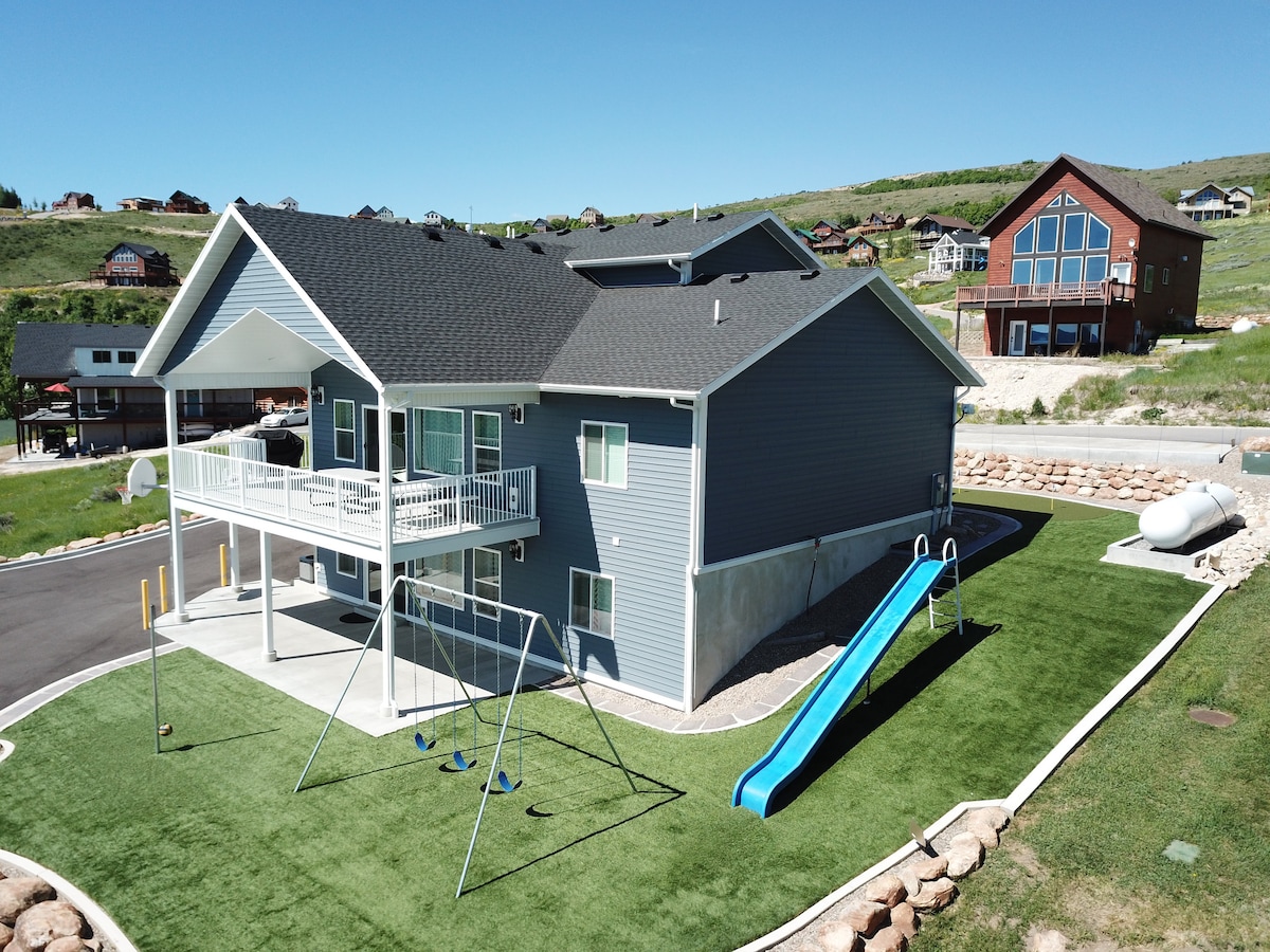 Sleeps 42 people, two complete kitchens. Large Reunions or small gatherings. Stunning Views of the Lake, close to stores and activities in Garden City. Part of the Raspberry Patch Subdivision and has EXCLUSIVE access to Harbor Village Pool, Hot Tub and Clubhouse. Minutes from the beach or the marina! Hiking, Biking and running trails out your front door. Gas fire pit and grassy backyard for games and relaxing. Several TVs throughout and WiFi for streaming.