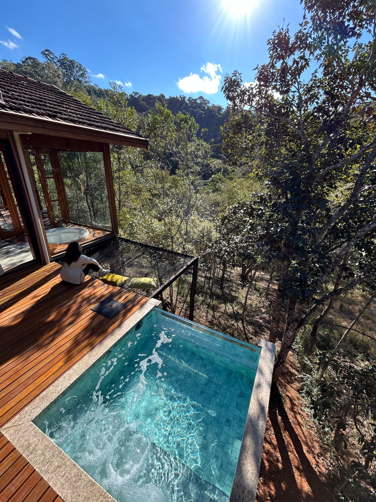Discover "Mirante da Coruja", a tranquil refuge amidst the treetops, built with reclaimed pinho de riga wood. This glass-walled chalet provides privacy, comfort, and stunning views. Equipped with a fireplace, a private deck, and a spacious terrace, it becomes the perfect backdrop for special celebrations and relaxing moments, combining local art authenticity with the magnificent surrounding nature.