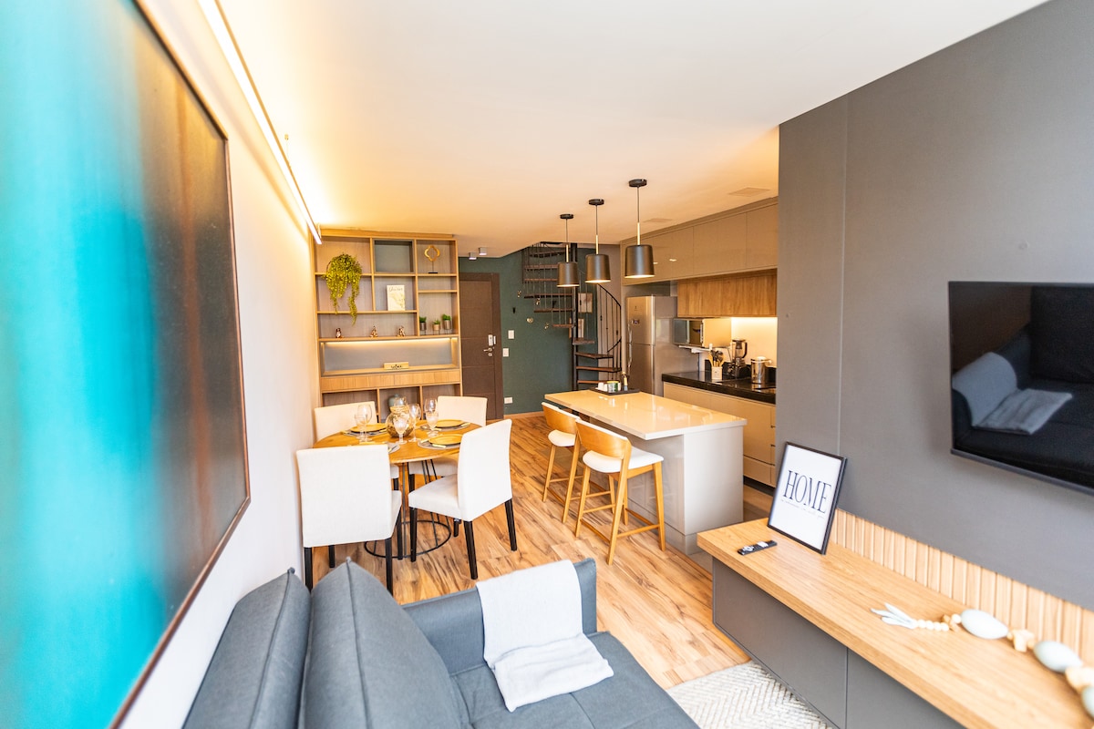Fique no centro turístico em um apartamento duplex novinho, prédio moderno, checkin por reconhecimento facial, vaga na garagem. O apartamento fica no segundo andar, acesso por elevadores. No andar superior uma cama de casal padrão e uma bicama (acesso por escada caracol), no andar térreo sofá cama e área comum, cozinha e lavabo. Disponibilizamos roupa de cama e toalhas, filtro de água.