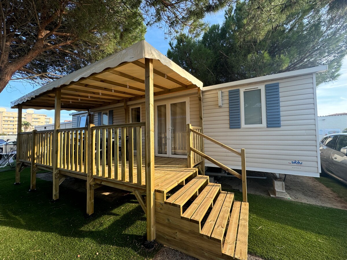 Notre mobil-home Chez Vivi et Cédric est situé dans un camping familial proche de la mer (15min à pied) mais aussi des montagnes (Font romeu) pour les amateurs de randonnées. En voiture, 2h de Barcelone, 20min de Perpignan, 10min Collioure. Vous aurez accès au camping (Piscine et bar du 15/04 au 30/09) animation🎉 , jeux extérieurs🏸🎾, pétanque ... Vous passerez d'agréable moment en Famille ou entre ami(es). Avec la terrasse couverte vous profiterez du barbecue à gaz pour de bonnes grillades