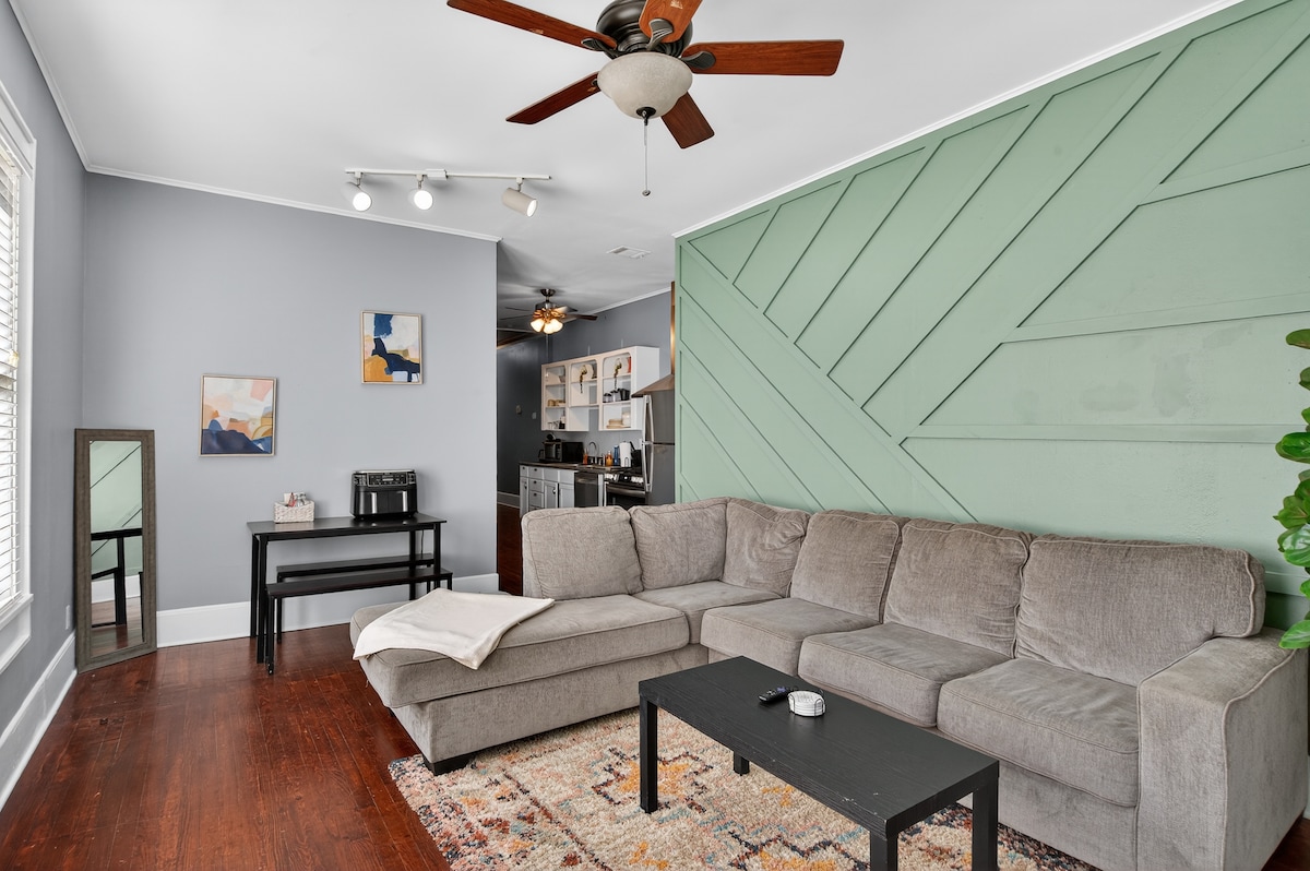 Kick back and relax in this stylish MCM space. We meticulously crafted this 2 bedroom, 1 bath apartment (1500 sq ft) using Mid-Century Modern design elements for a one-of-a-kind feel. Whether you're here on a work trip or traveling with friends/family look no further!! Every inch of this unit has been updated from refinished hardwoods to quartz countertops, all new appliances, & designer furniture. Property has washer/dryer in the unit & off-street parking. This is the ONE!! ☺️ 🏡 ✨