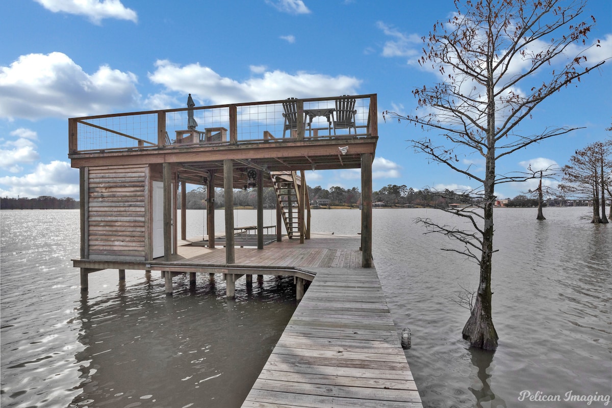Enjoy Lake Access, fishing, kayaking or just relaxing on the back porch,deck or around the fire pit. Rent a boat from Barron's and drive it under the bridge to the property. House is 3000 sq ft remodeled. Downstairs master suite. 3 bedrooms upstairs with bathroom and playroom/office that has a queen sleeper sofa can sleep additional 2 people. Master has queen bed. Upstairs has a king, 3 full beds, and sleeper queen. Get the real Louisiana feel with cypress trees and lake cove views unmatched.