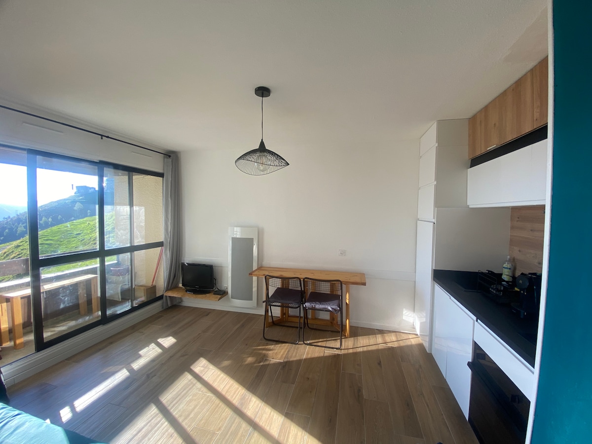 Studio cabine 20m², en angle, aucun vis à vis et superbe vue sur la vallée. Balcon 4.5m² Résidence le Grand Stemm. Idéal couple ou couple + 1 enfant Logement entièrement refait à neuf. Entrée avec Coin cabine, 2 lits superposés. Salon avec placard, buffet, tv, canapé lit avec vrai matelas en 160! Table hautes et 4 tabourets Dans le logement, tout pour manger et faire la cuisine, tout est neuf, moderne, appareil à raclette présent! Senseo. Draps et alaise à prévoir obligatoirement! Merci