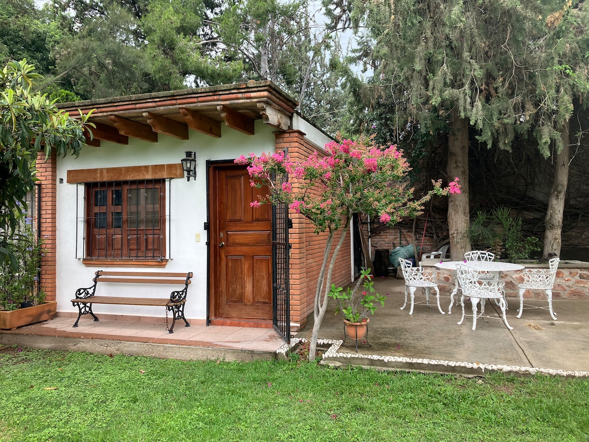 Se renta preciosa suite para una o dos personas en los jardines arbolados de una casa en Tequisquiapan, Qro. Cuenta con cocineta equipada, TV, Netflix y buena señal de internet. Ideal para pasar un fin de semana relajado, hacer Home Office en un seguro y apacible lugar o para personas retiradas que quieran disfrutar de la paz de la naturaleza. Ubicada en el Fraccionamiento Los Sabinos, Tequisquiapan, Qro., a 15 min a pie del Centro Histórico. No aceptamos mascotas.